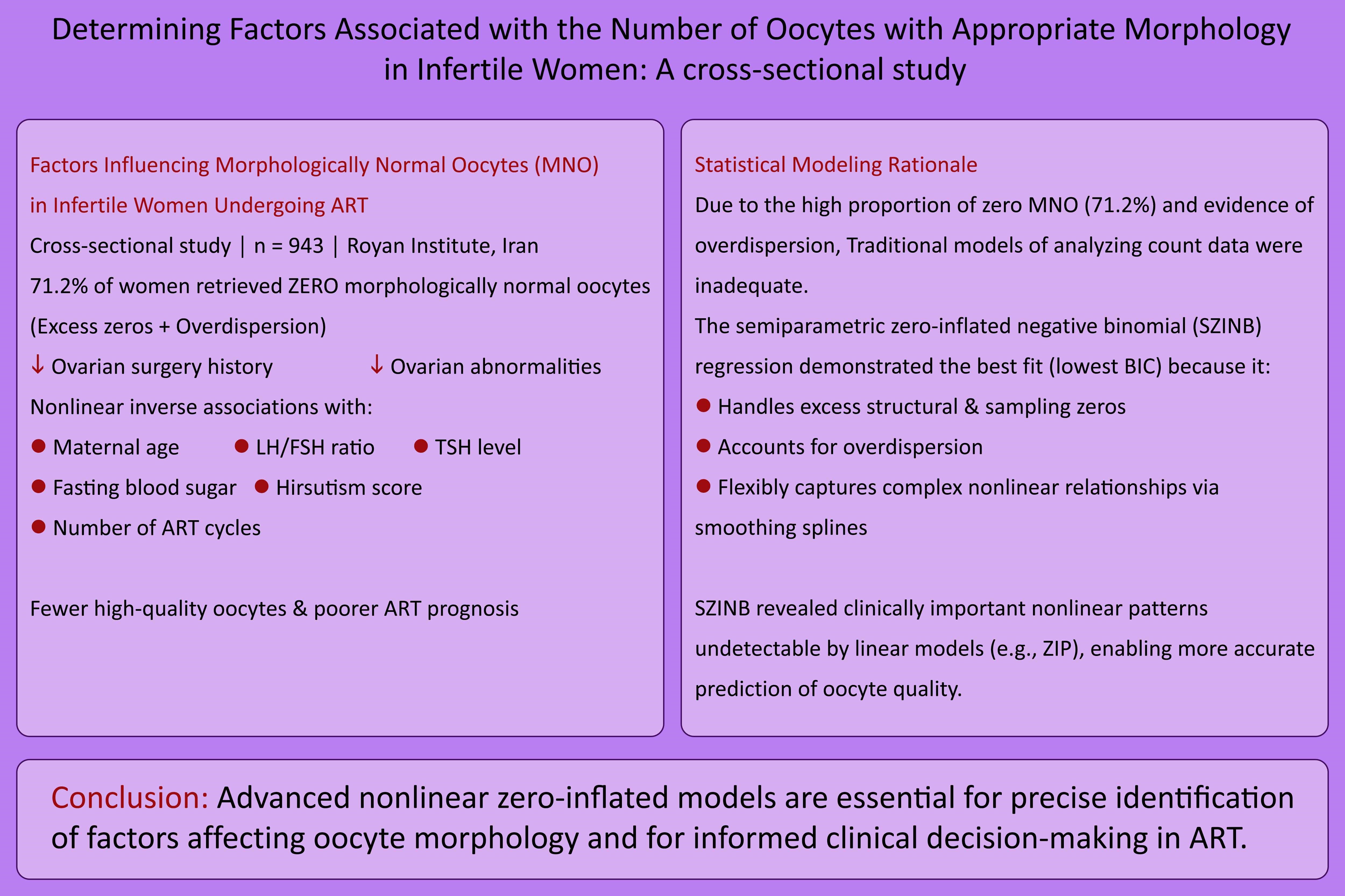 Background: Infertility affects millions of couples worldwide. The number of morphologically normal oocytes (MNO) is a key determinant of assisted reproductive technology success. Accurate identification of influencing factors is limited by excess zeros in real-world clinical data.
