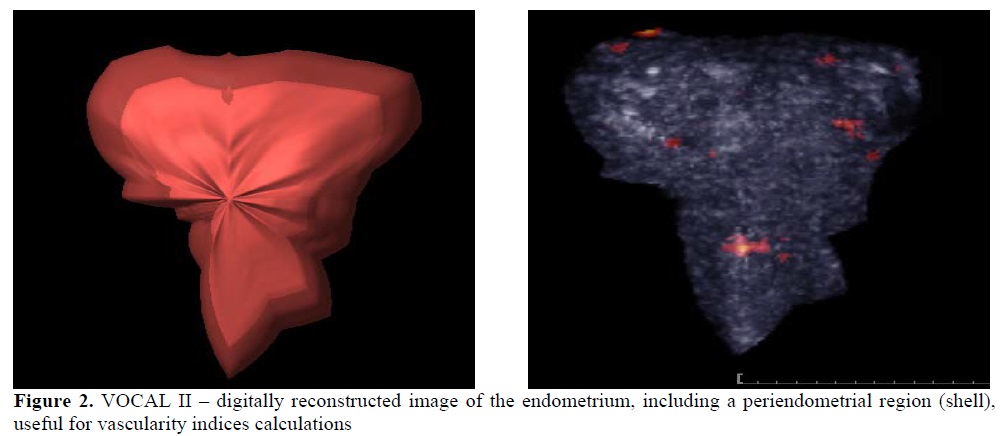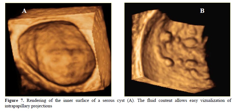 Abnormal vascularisation, with increased RI in the dominant ovary is a marker of lutheal phase defect and a poor pregnancy outcome (15). The solitary ovarian cyst benefits of a correct volume calculation using 3D ultrasound and a graphic representation of the structure, its shape and relations. A cyst offers a fluid environment, facilitating the view of inner structures, such as intracystic papillae or vegetations, clearing the etiology and the prognosis (figure 7). It interferes with fertility whenever a great proportion of ovarian substance is destroyed, but it represents one of the most frequent sonographic findings. The VOCAL II associated with Doppler acquisition offers information about peripheral vascularisation, as a supplementary prognosis index.