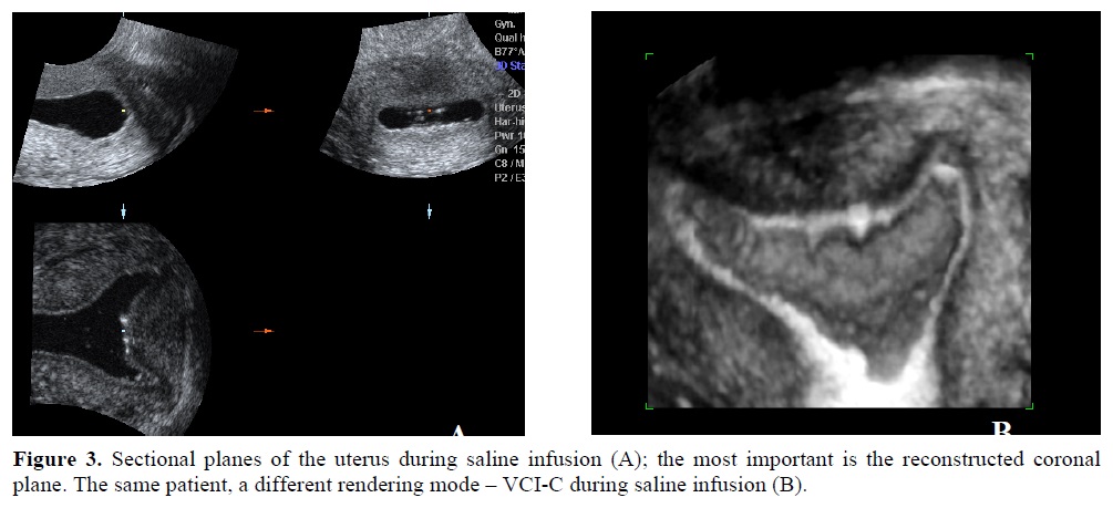 1. Normal uterus is easily assessed using 3D ultrasound, where the coronal plane gives a good image of the endometrial cavity, the surrounding myometrium and of the uterine external contour, a fact of most importance. Conventional ultrasound, with a thorough scan in both sagital and transverse sections, offers an almost complete description of the uterus, endometrial thickness and vascularisation pattern. Three dimensional ultrasound does not substitute, but completes the