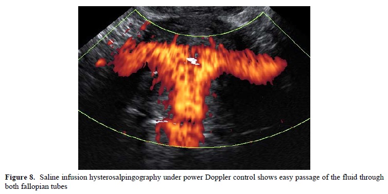 A variable amount of saline solution is injected in pulses, under continuous vaginal scan. Power Doppler permits a good image of the tubal passage (figure 8) and it may be combined with 3D acquisition, creating a graphic representation of the fallopian tube. In some cases during the saline passage the tube is dilated such as a static acquisition with inversion mode is possible, but this is rather accidental, as it requires a long saline pulse and an important tubal diameter.