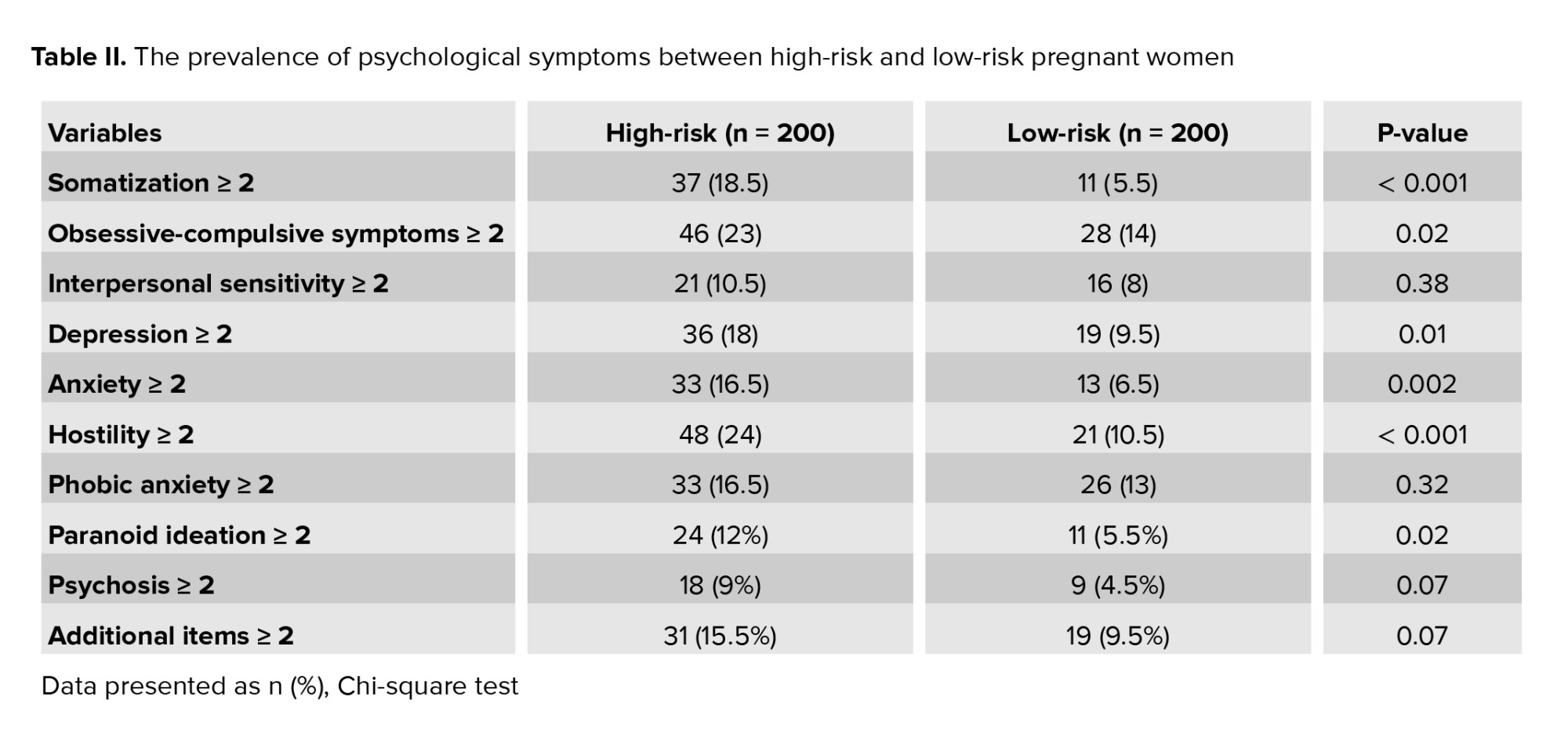 Therefore, this study aimed to investigate the prevalence of psychological symptoms in low-risk and high-risk pregnant women.