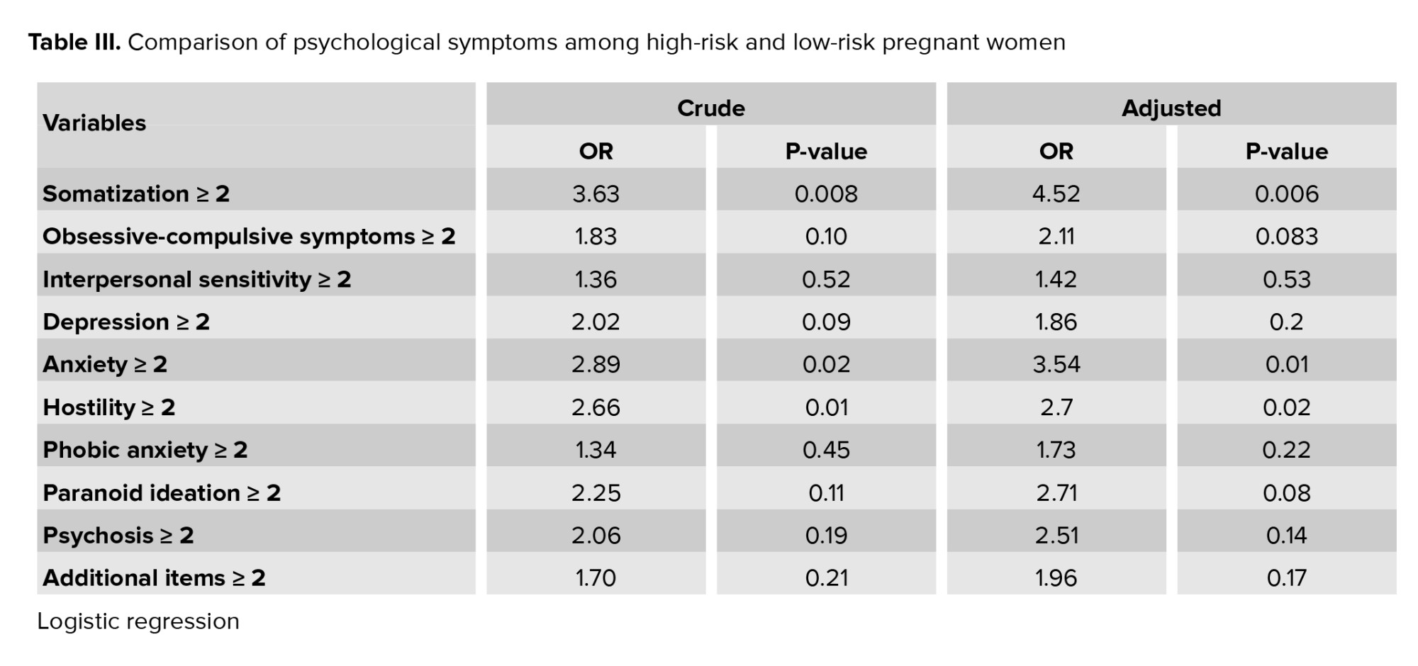 After considering the confounding variables (age, education, and gestation period), high-risk pregnant women suffered from somatization symptoms (OR = 4.52, p = 0.006), anxiety symptoms (OR = 3.54, p = 0.01), and hostility symptoms (OR = 2.7, p = 0.02) than healthy women (Table III).