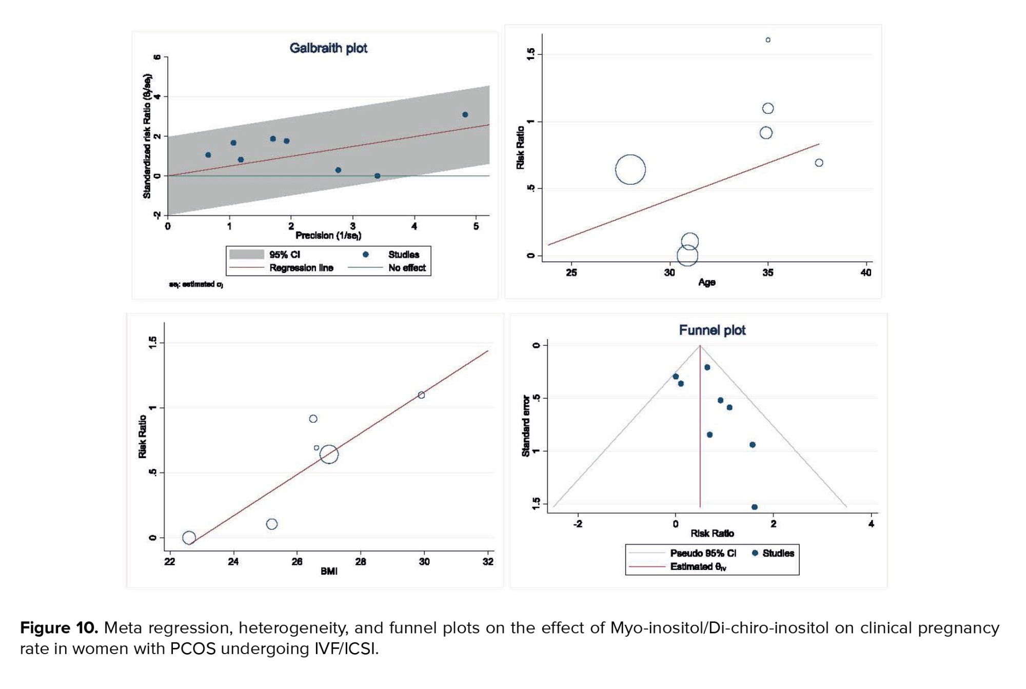 Heterogeneity, meta-regression analyses based on BMI and age of women with PCOS, and the publication bias diagram are presented in figure 10. The results showed that the effect of myo-inositol/D-chiro-inositol on clinical pregnancy rates increased with age (B: 0.054; SE: 0.072; p = 0.485; 95% CI: -0.13, 0.24). Additionally, as BMI increased, the effect of the drug on clinical pregnancy rates also increased (B: 0.158; SE: 0.069; p = 0.085; 95% CI: -0.03, 0.35). However, neither age nor BMI had a statistically significant impact on the meta-regression analysis (Figure 10).
