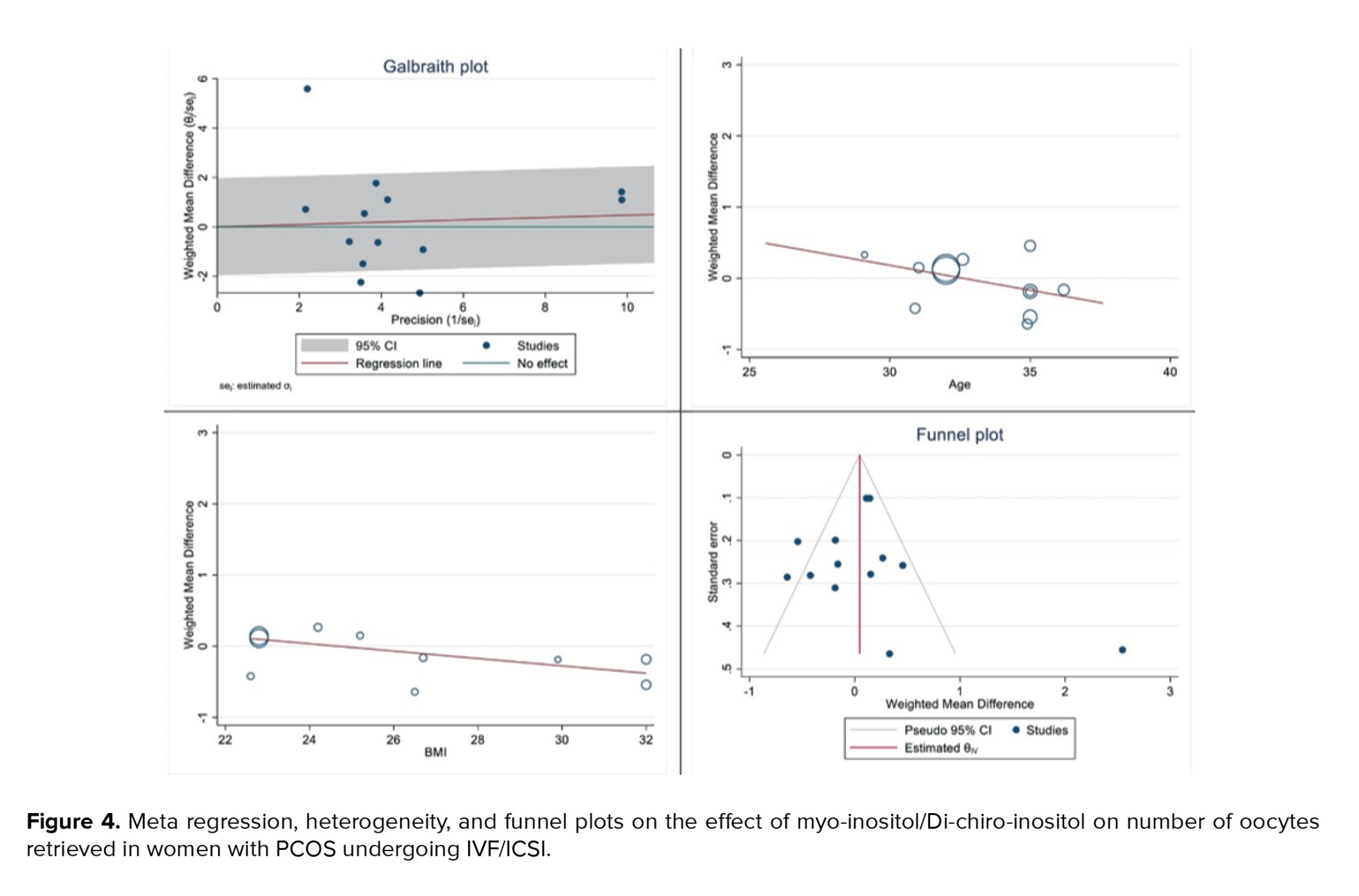 The results of heterogeneity, meta-regression based on the BMI and age of women with PCOS and the publication bias diagram have been reported in figure 5, the results of which showed with increasing age, the effect of myo-inositol/D-chiro-inositol on the number of metaphase II oocytes retrieved decreased (B: -0.298; SE: 0.064; p = 0.001; 95% CI: -0.439, -0.157). Also, with increasing the BMI, the effect of this drug on the number of metaphase II oocytes retrieved decreased (B: -0.120; SE: 0.057; p = 0.024; 95% CI: -0.24, -0.004), which was not statistically significant (Figure 5). Publication bias was assessed using a Funnel plot and Egger’s test. The test results showed that it occurred in the analysis of the effect of myo-inositol/D-chiro-inositol on the number of metaphase II oocytes retrieved in women with PCOS (B: -8.69; SE: 0.69; p = 0.0001) (Figure 5).