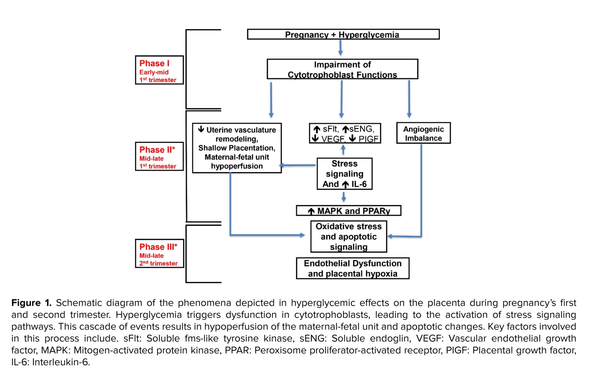 Hyperglycemia impacts the ability of CTB cells to invade during placental formation. Typically, CTB cell invasion is facilitated by converting plasminogen to plasmin through the action of a urokinase plasminogen (uPA) activator. The activity of uPA is controlled by plasminogen activator inhibitor-1; both plasminogen activator inhibitor-1 and uPA are downregulated at the level of CTB cells subjected to hyperglycemic insults. Vascular endothelial growth factor and placental growth factor, essential pro-angiogenic factors for placental development, experience downregulation, while antiangiogenic factors such as soluble fms-like tyrosine kinase-1 and soluble endoglin, which hinder normal placentation, can be upregulated. This hyperglycemia-induced dysregulation activates stress signaling pathways, leading to aberrant placentation, potentially resulting in complications like pre-eclampsia during later stages of pregnancy (11).