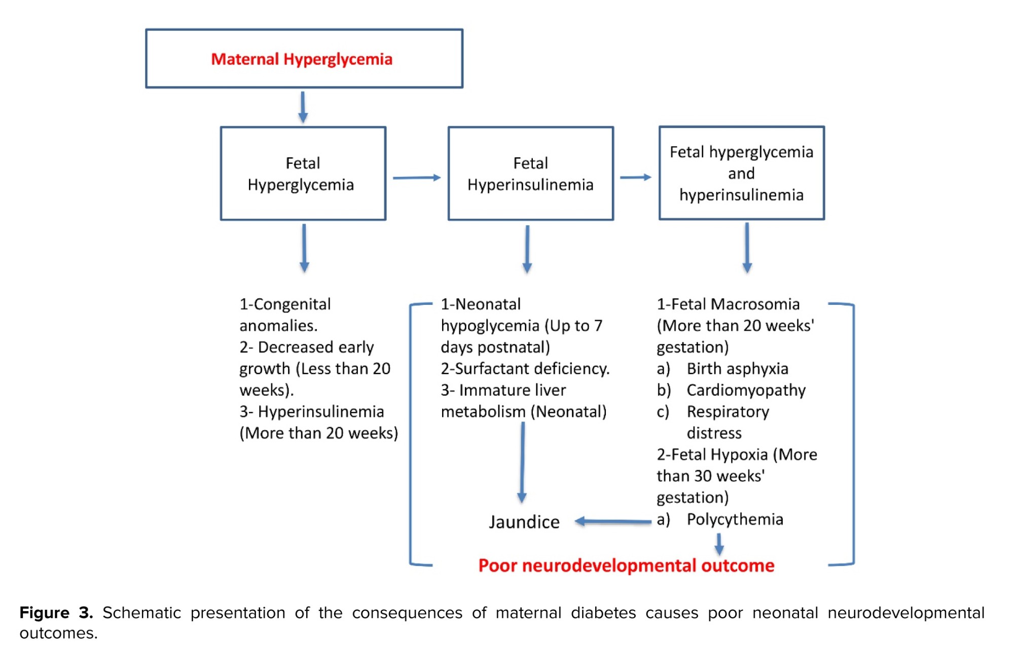 In addition to adverse outcomes during the neonatal period, many other effects on the infant may present later in life. There is an association with delayed brain maturity that results in neuronal and behavioral changes. This contributes to lower intelligence than average babies, language impairments, visual impairments, difficulty in concentration, impulsivity, and cognitive deficits (53, 54). There is an increased risk of schizophrenia and autism spectrum disorders in diabetic pregnancies (55, 56). The neurodevelopmental outcomes have been schematically presented in figure 3.
