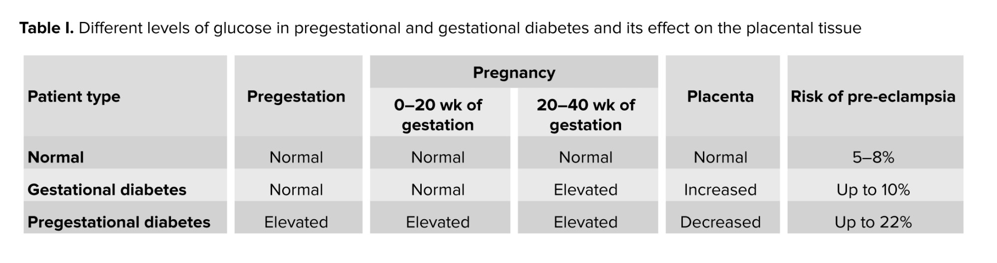 Women with pregestational diabetes (type 1 DM, type 2 DM) and gestational diabetes continue to have poorer pregnancy outcomes than the background population (23, 24). The risk of pre-eclampsia is increased in women with diabetes; however, the exact mechanism of pre-eclampsia is not entirely understood.