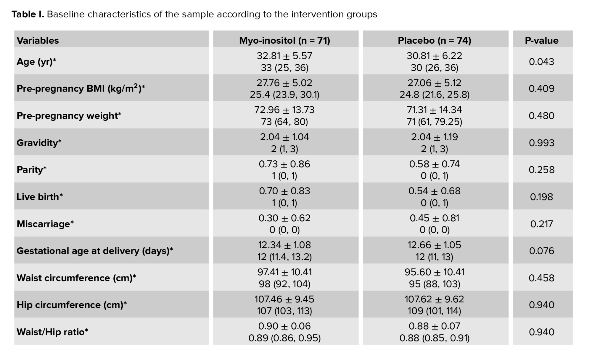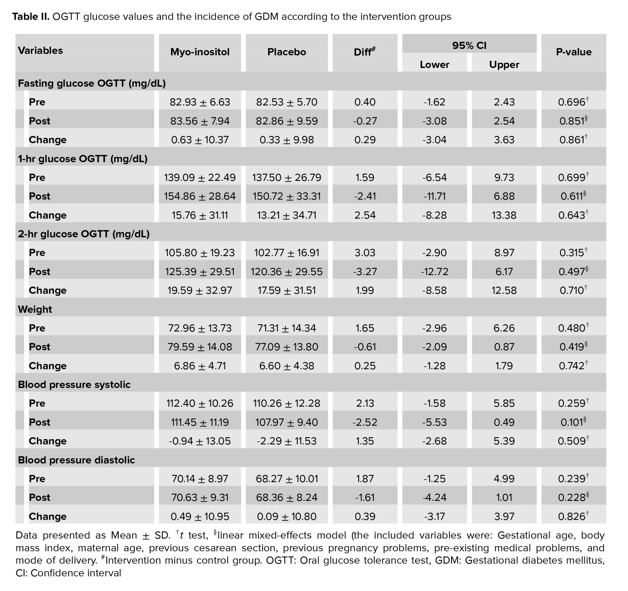 Women in the MI group received 2000 mg MI plus 200 µg folic acid (Inofolic; Lo.Li. Pharma International, Rome, Italy) twice a day until 24-28 gestational weeks for a total of 14 wk, and women in the placebo group received 400 mg folic acid daily. All participants in both groups were given the same consultation in terms of exercise, nutrition, and lifestyle at the time of enrollment. In each visit, participants were followed up until delivery about potential side effects of the drug, such as headache, gastrointestinal problems, nausea, vomiting, insomnia, and tiredness, and information were collected by a data gatherer who was blinded to the recruitment process. In our study, the primary outcome was GDM. All women underwent 75-gr OGTT at 24-28 wk, and the test was interpreted based on the International Association of Diabetes and Pregnancy Study groups recommendation (6). GDM was diagnosed if one or more of the 3 values exceeded or equaled the threshold. The threshold values were 92 mg/dl, 180 mg/dl, and 153 mg/dl for fasting glucose, the 1st and 2nd hr after glucose load, respectively.