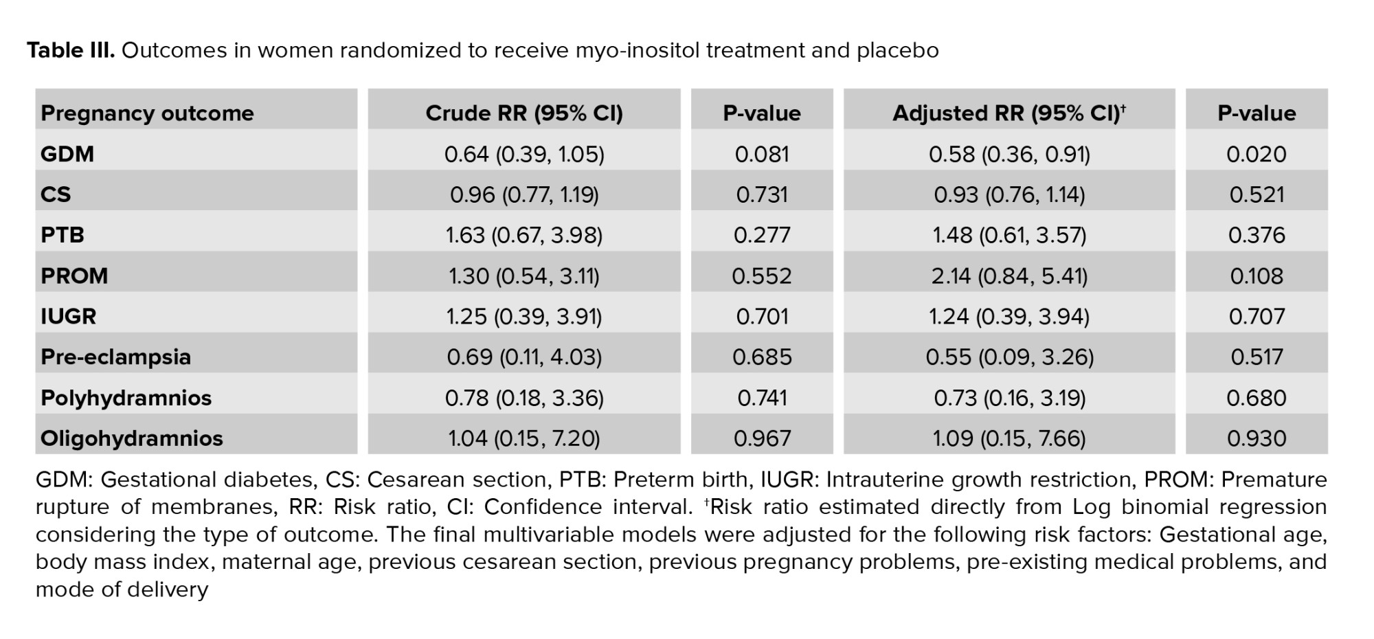 In our study, consuming MI supplements from 11-14 wk of gestation with a dose of 2 gr twice a day for 14 wk significantly reduced the incidence of GDM in women who had at least one risk factor for GDM. However, other pregnancy outcomes, including PTL, PPROM, IUGR, pre-eclampsia, polyhydramnios, oligohydramnios, and also glucose values in OGTT steps were not affected.