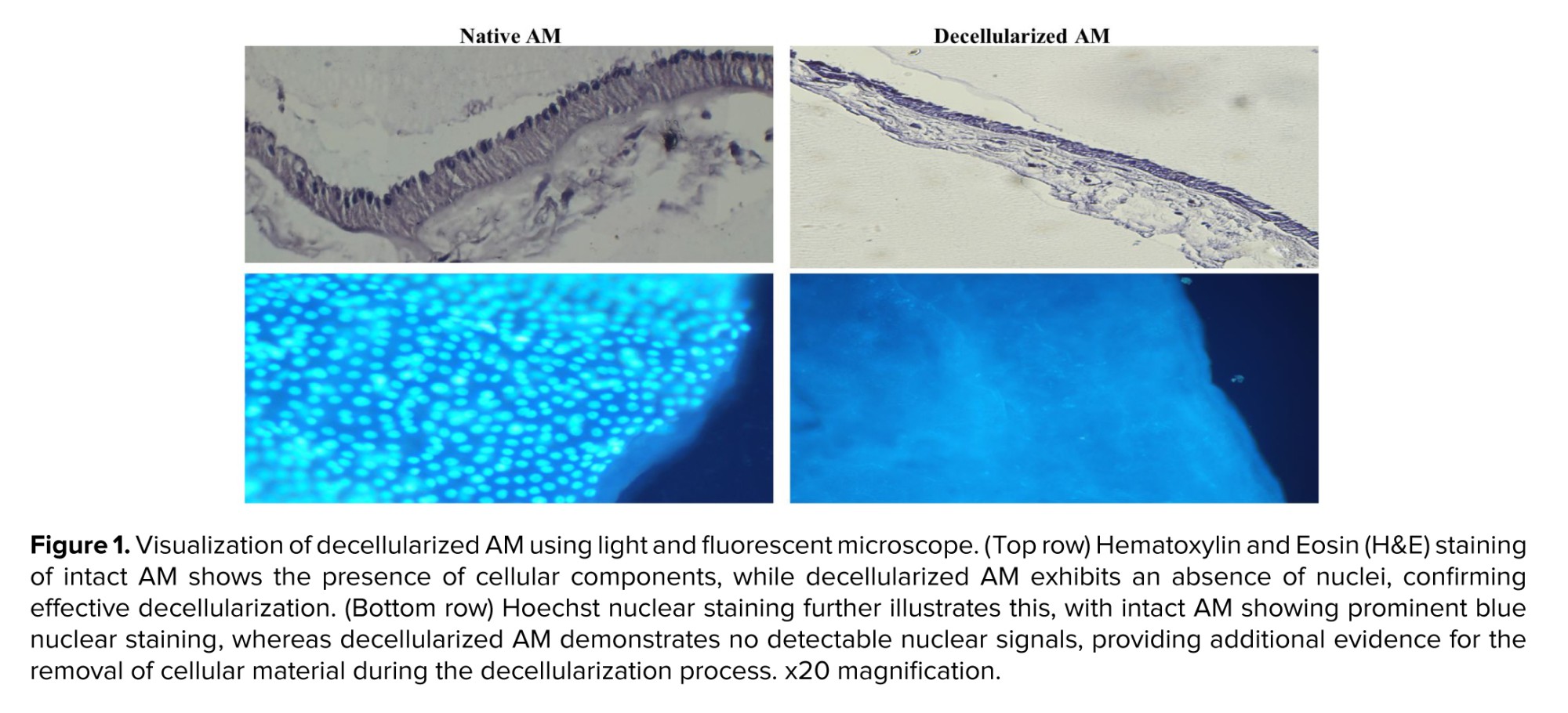 Histological analysis using H&E staining confirmed the effectiveness of the decellularization process. All nuclei were absent in the decellularized AM, indicating complete cellular removal. DNA staining further corroborated this finding, validating the absence of residual cellular material (Figure 1).