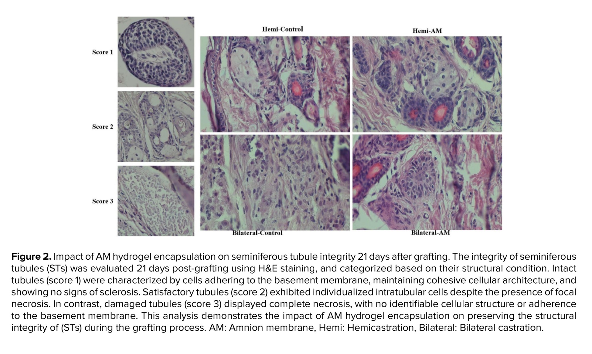 In this experimental study, which was conducted at the Urology Research Center of Tehran University of Medical Sciences, Tehran, Iran between 2022 and 2024, small fragments (1-3 mm3) of mouse testicular tissue from NMRI mice that had undergone hemilateral or bilateral castration (removal of one or both testes) were autotransplanted under the dorsal skin of the same mouse, with nonencapsulated grafts placed on the left and amnion membrane (AM) hydrogel-encapsulated grafts on the right. The grafts were then retrieved for analysis after 21 days.