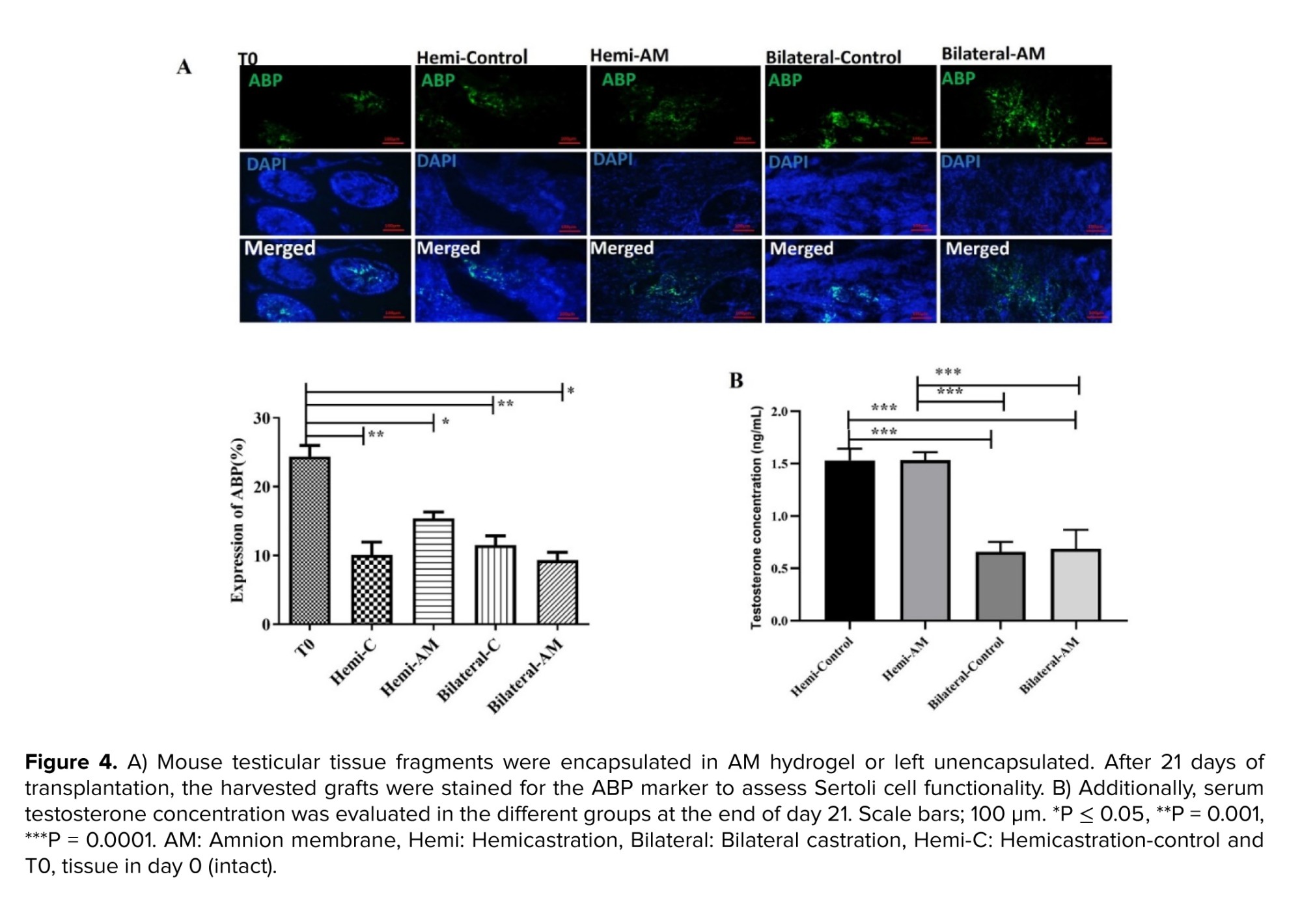 16 male NMRI mice, aged 4-5 wk, were included in the study. The animals were procured from the Pasteur Institute of Iran. Prior to the experiments, the animals were housed in a standard laboratory environment for 1 wk. The conditions included a temperature range of 22-25°C, a 12-hr light/dark cycle, and a relative humidity of 40-60%. The animals had unrestricted access to food and water during this acclimation period. The mice were anesthetized using an intraperitoneal injection containing ketamine (87.5 mg/kg) and xylazine (12.5 mg/kg) (Merck KGaA, Germany). Bilateral castrationl or hemicastration was performed along with the creation of skin flaps on their back skin during the same surgery. Tissue encapsulation and grafting were carried out in accordance with a previous study (13). Each side received transplantation of one fragment (1-3 mm³) either encapsulated in nonhydrogel or AM hydrogel, following incubation at 37°C/5% CO2 for approximately 25 min after being placed in physiologically balanced AM hydrogel (6 mg/mL). After 21 days, euthanasia by cervical dislocation was carried out, and grafts were harvested and fixed directly in a solution consisting of up to 4% paraformaldehyde, followed by analysis.