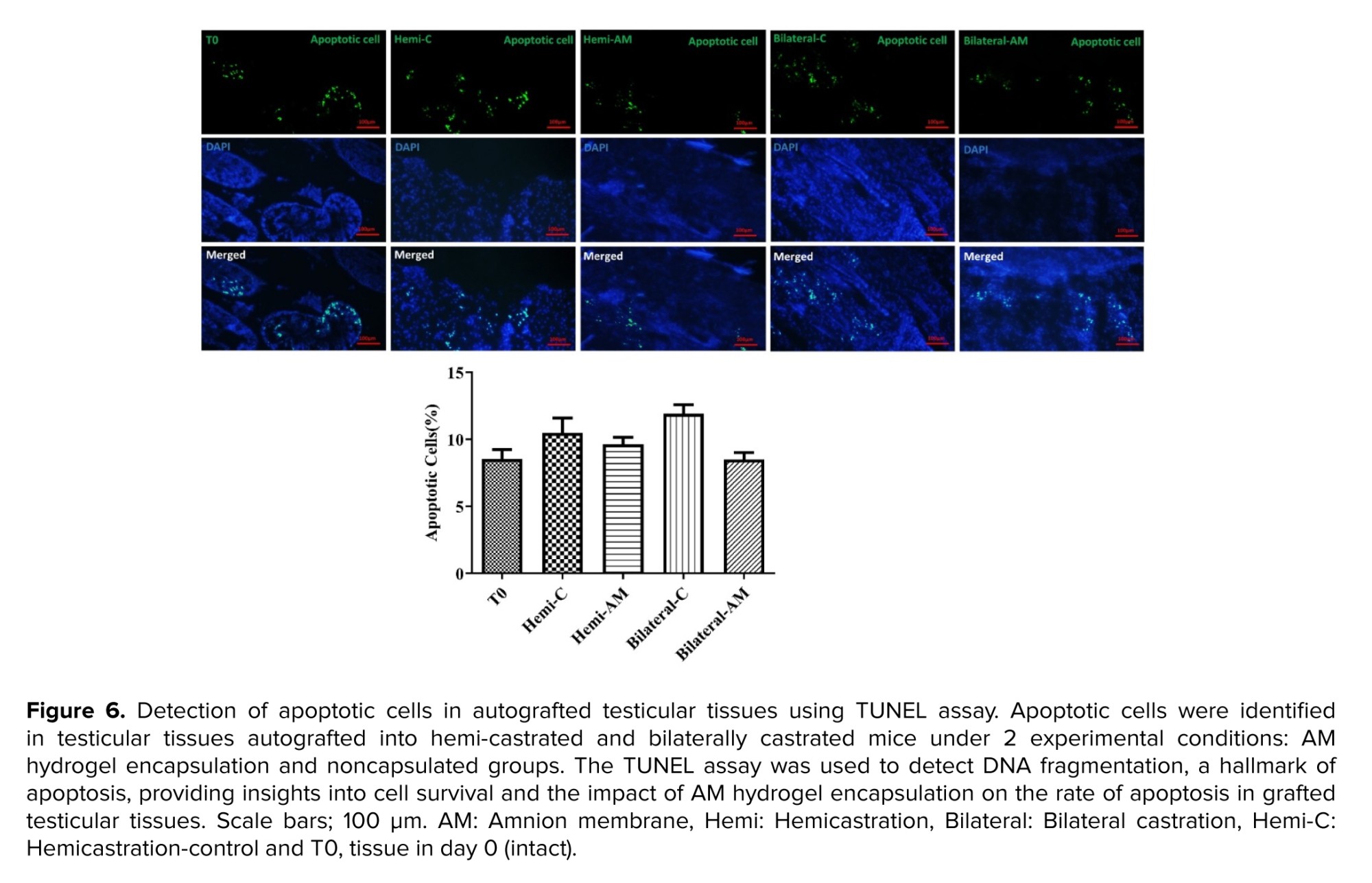 In this study, testicular tissues were encapsulated in hAM hydrogel and autotransplanted to evaluate its potential for improving the efficiency of autologous transplantation of fresh testicular tissues in adult mice undergoing hemicastration (removal of one testicle) or bilateral castration (removal of both testicles).