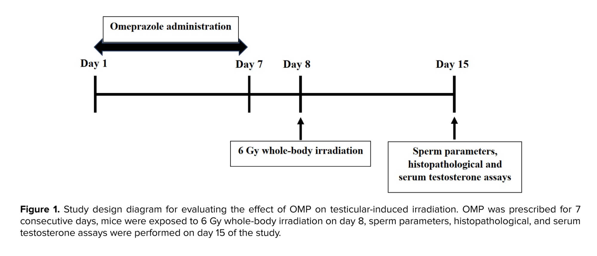 Animals in all groups were killed on day 15 of the study (1 wk after irradiation) and sperm parameters, histopathological, and serum testosterone assays were performed (Figure 1).