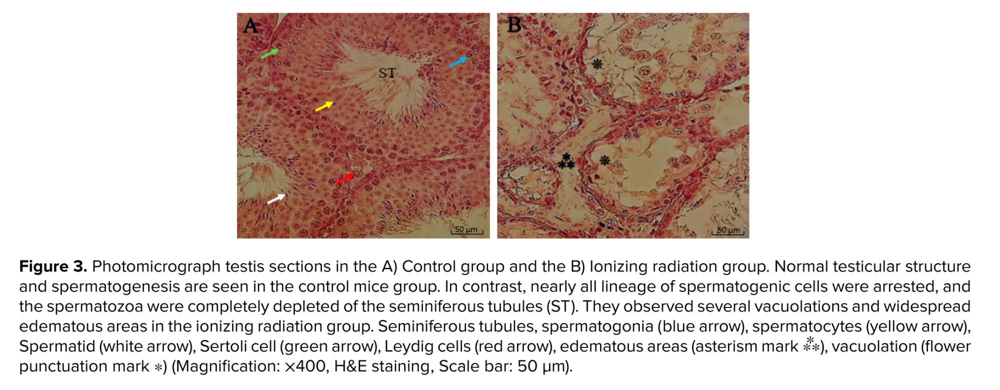 Radiation can cause several histopathological changes in testicular tissue, spermatogenic cell damage and reduction in spermatogenesis due to damage to spermatogonia and spermatocytes, testicular atrophy, and tubular damage to seminiferous tubules, including fluid accumulation and several vacuolations in the interstitial spaces (6).