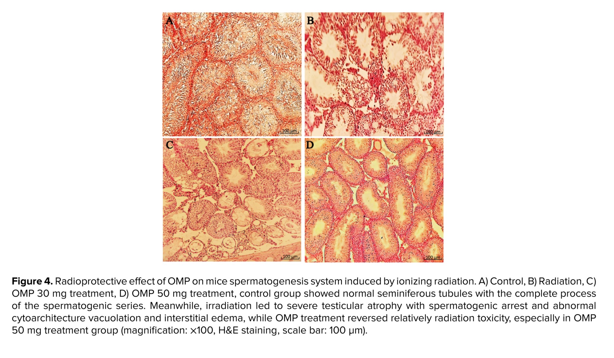 All of this evidence can be seen in the present study. The histopathological results showed that ionizing radiation caused a significant alteration in the testicular structure parameters, as evident nearly all lineage of spermatogenic cells were arrested, and the spermatozoa were completely depleted of the seminiferous tubules and were observed in several vacuolation and widespread edematous areas. Morphometric examination of the testes showed that OMP could preserve seminiferous tubules of testes in mice that received irradiation. In this study, data showed that the most protective effect of OMP is at a dose of 50 mg/kg in the testes exposed to irradiation.