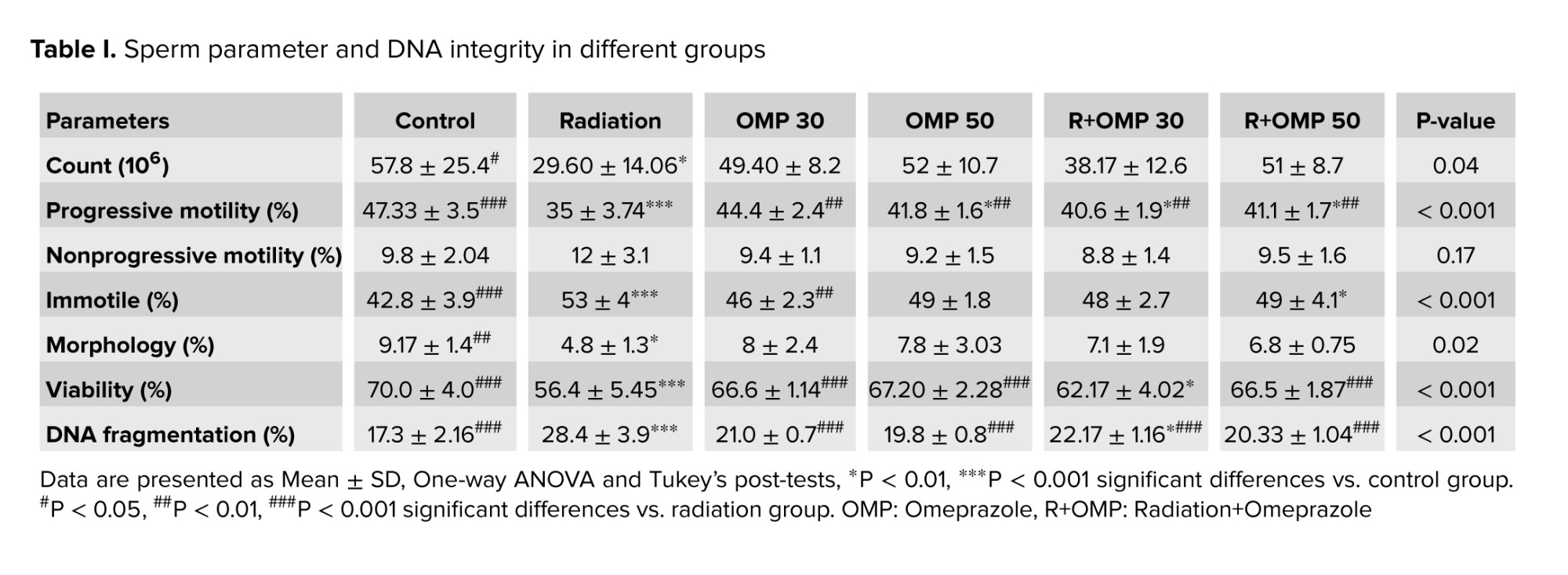 The results of independent t test showed that the percentage of sperm with fragmented DNA significantly increased in the radiation group compared to the control and R+OMP 30 groups (p < 0.001, p < 0.05). In addition, all OMP groups significantly decreased the percentage of DNA-fragmented sperm in comparison with the radiation group (p < 0.001) (Table I).