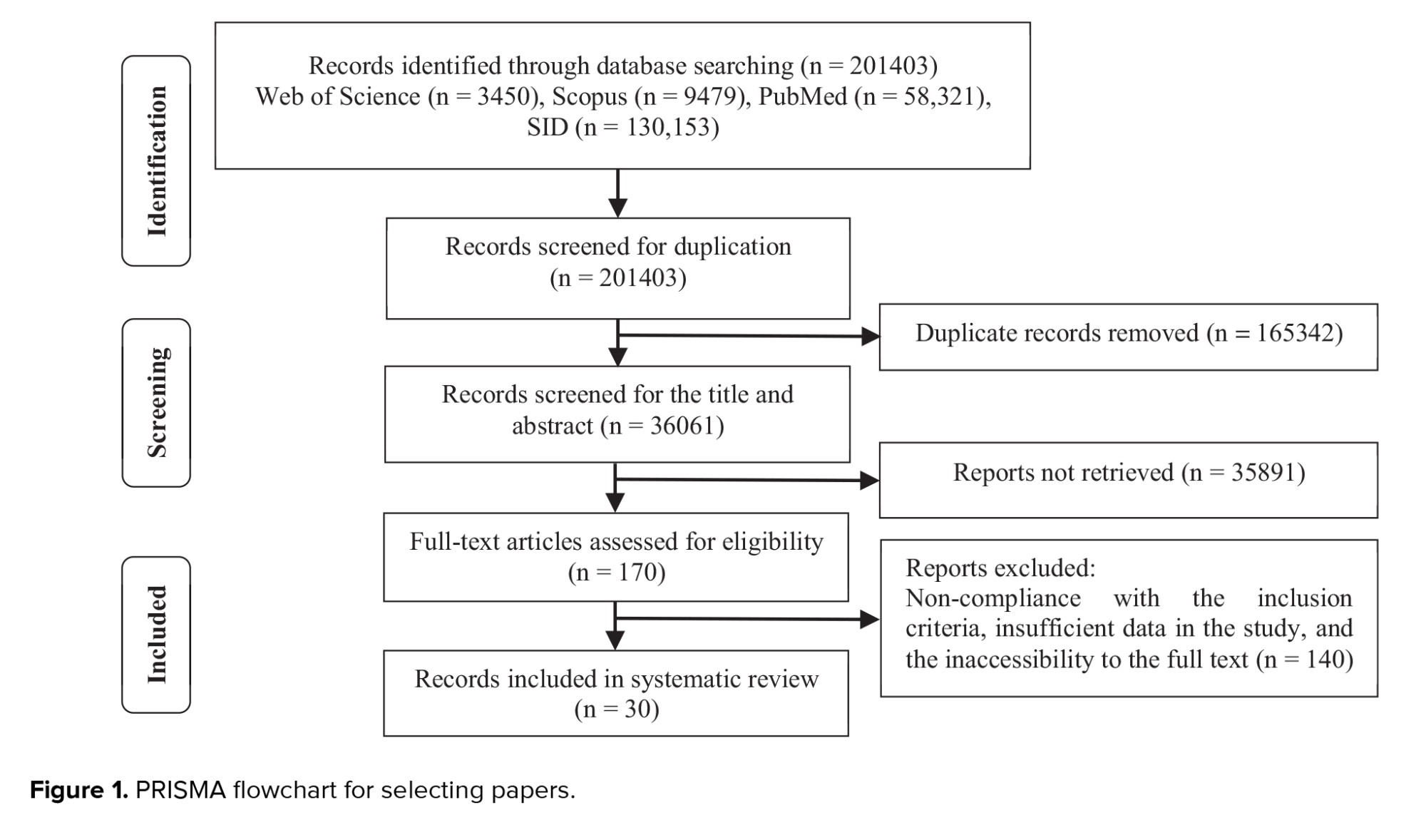 Out of 201,403 eligible articles identified, 165,342 were duplicates and were not included in the study. 2 independent reviewers evaluated the titles and abstracts of 36,061 studies. Moreover, 35,891 papers had unrelated reports and were excluded. Finally, 170 eligible papers were analyzed by both reviewers. Although some studies met the inclusion criteria, they were excluded because the full text of the article was not available. Of these papers, 140 were excluded due to insufficient data and lack of access to complete data. Thus, 30 papers were finally included in the study. The search and selection process are presented in figure 1 using the preferred reporting items for systematic reviews and meta-analyses flowchart.