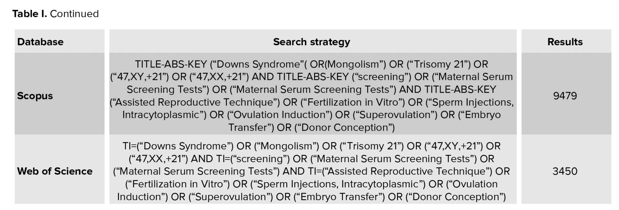 A systematic review was conducted in Persian and English in PubMed, Scopus, SID, Google Scholar, and Web of Science databases. The search was performed in PubMed using MeSh terms in combination with keywords (Downs Syndrome) or (Mongolism) or (47,XY,+21) or (47,XX,+21) or (Trisomy 21) and (screening) or (Maternal) (Serum Screening Tests) or (Prenatal Diagnosis) and (Assisted Reproductive Technique) or (Fertilization in Vitro) or (Sperm Injections, Intracytoplasmic) or (Ovulation Induction) or (Superovulation) or (Embryo Transfer) or (Donor Conception). This search strategy was adapted to other databases. For complete searching, all citations were imported into the EndNote basic database (Table I). Based on a comprehensive list of possible synonyms for each term, a search was followed up to April 2023. Synonyms combined with the conjunction "OR" and a search for all 4 characteristics together with "AND" yielded a list of sources used to search for related papers. Data extraction of eligible papers was conducted independently by 2 researchers.