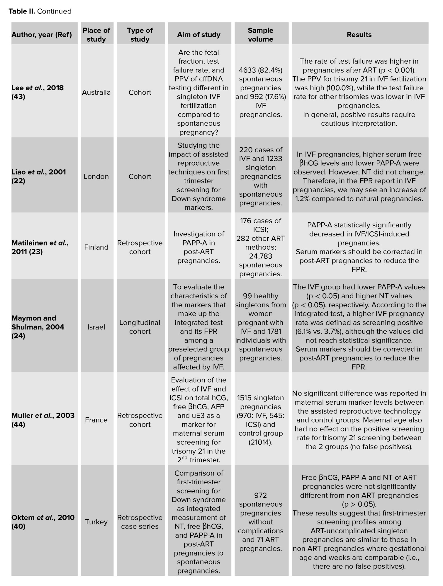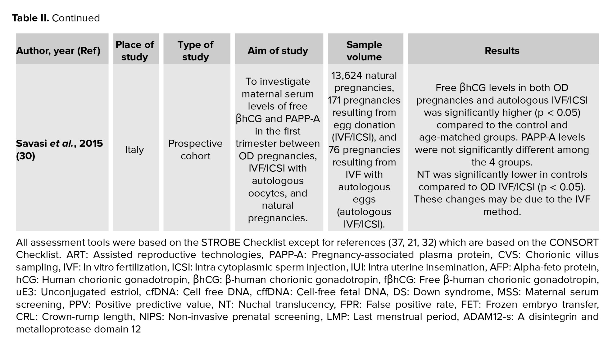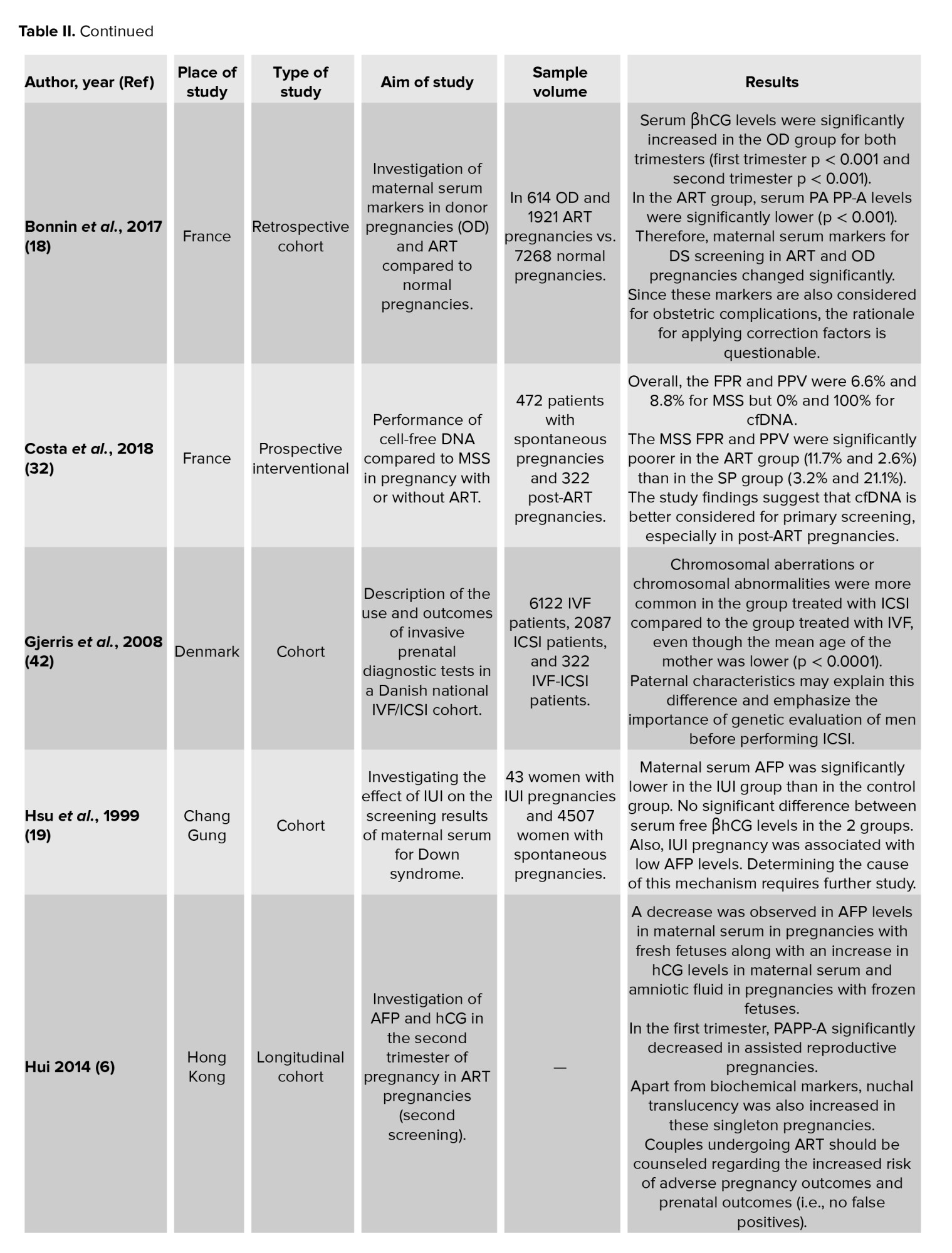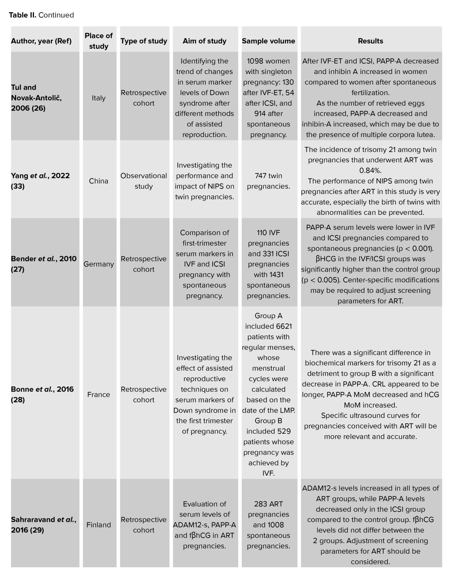 One of the strengths of the present systematic review was that it was the first systematic review that evaluated both serum and sonographic markers in both screening rounds for prenatal diagnosis of Down syndrome in post-ART pregnancies. However, due to the limitation of the data of the studies included in the present review, it was not possible to conduct a meta-analysis.