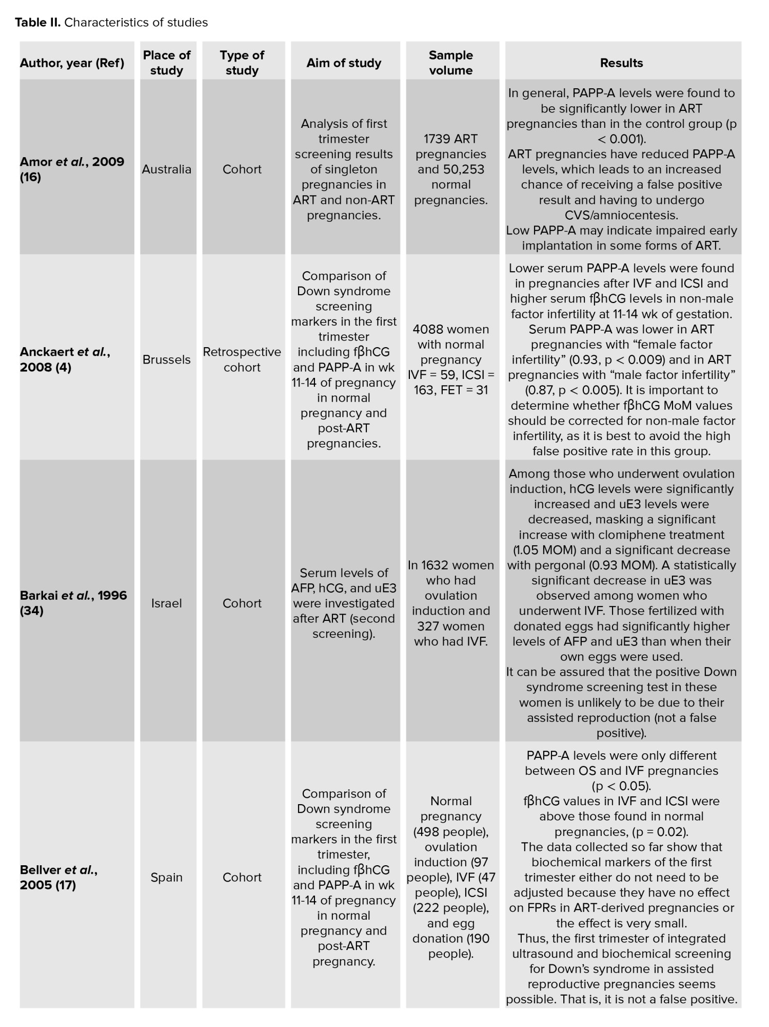 The present study is a systematic review. To determine the time interval and keywords, first, an extensive search was conducted in Persian and English in PubMed, Web of Science, Scopus, SID, and Google Scholar databases. Accordingly, to obtain a comprehensive number of documents, a search was made without applying a time limit until January 2024 (Table I). To strengthen the obtained information, the characteristics of the papers were also examined (Table II) (13). Further, to access all the information available on the subject, no limitations were considered in terms of the methodology of the papers, and every document in Persian and English that focused on prenatal screening for Down syndrome in post-ART pregnancies was considered. The papers in languages other than Persian and English were not included in the study. In addition, papers whose full text were not available or studies that focused on other trisomies, such as trisomy 13 and 18 were also excluded from the study. Based on the inclusion criteria, searching documents and evaluating the titles of the papers was carried out by one of the researchers. Then, the abstracts and titles of the resulting papers were evaluated based on the inclusion criteria by 2 other members of the research team. If 2 researchers had different opinions in evaluating the abstracts of papers, a third researcher decided on the inclusion of that paper. Subsequently, to check the quality of papers after preparing their full text, the STROBE checklist was used to evaluate descriptive studies. Besides, ‘15.5’ was considered as the minimum obtainable score for the STROBE checklist (14). The CONSORT scale quality scoring system was used for clinical trials. The total score of the scale based on these statements is 5. Papers with a score of 3 or higher were included in the study (15).
