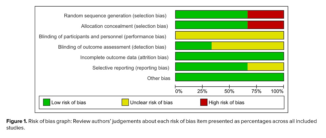 The methodological quality of the studies included in this systematic review and meta-analysis was independently assessed by 2 reviewers using the Cochrane risk of bias tool within review manager. 7 distinct domains are assessed using this tool, including random sequence generation, allocation concealment, blinding of participants and personnel, blinding of outcome assessment, incomplete outcome data, selective reporting, and additional potential sources of bias (13).