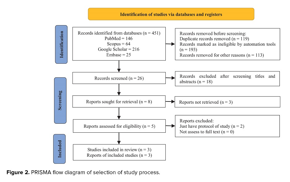 In the initial search, 451 articles were retrieved. Following the removal of duplicates and obviously irrelevant studies, 26 articles were screened using their titles and abstracts. Of these, 18 articles were excluded for specific reasons, including lack of an intervention group, nonclinical trial design, insufficient data, or irrelevance to the study objectives. 8 articles were selected for full-text assessment. After applying the inclusion criteria, 5 studies were further excluded. Ultimately, 3 clinical trial studies met all eligibility criteria and were included in the final analysis. The PRISMA flowchart illustrating the study selection process is shown in figure 2.