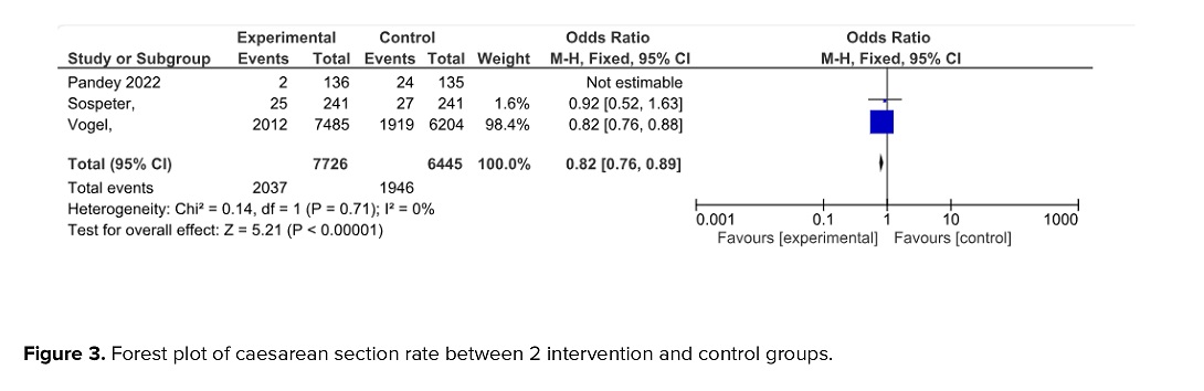 The meta-analysis showed a statistically significant reduction in the caesarean section rate in the intervention group compared to the control group (OR = 0.82; 95% CI: 0.76-0.89; Figure 3).