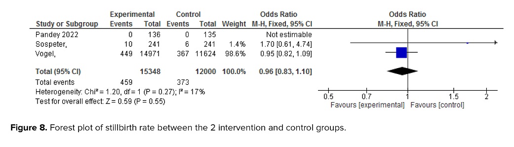 The meta-analysis indicated no significant difference in stillbirth rates between the intervention and control groups (OR = 0.96; 95% CI: 0.83-1.10; Figure 8).