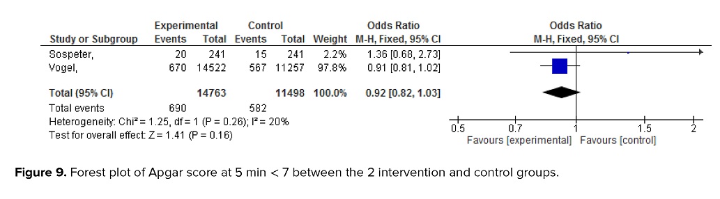 The meta-analysis revealed no significant difference in the rate of Apgar score < 7 at 5 min between the intervention and control groups (OR = 0.92; 95% CI: 0.82-1.03; Figure 9).