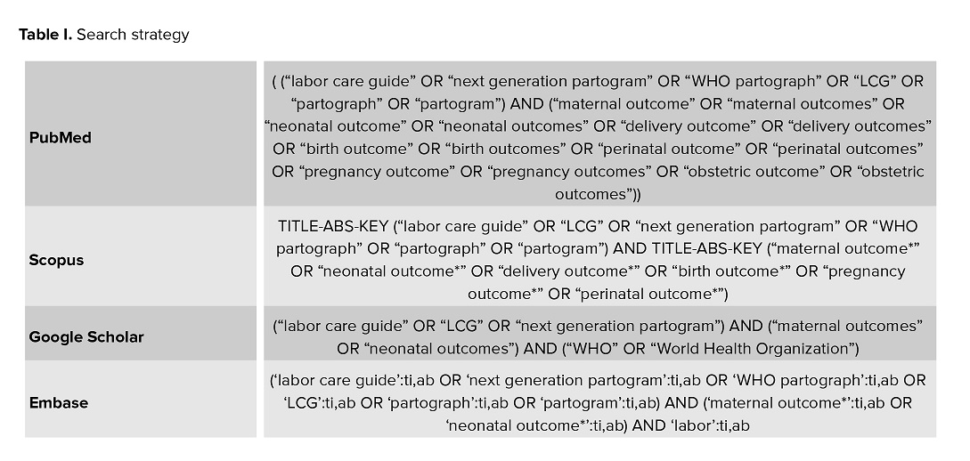 A comprehensive and systematic search was conducted to identify relevant studies examining the impact of the WHO LCG on maternal and neonatal outcomes. The literature search was performed in the electronic databases PubMed, Scopus, Google Scholar, and Embase for articles published up to September 2024, without any language restrictions.