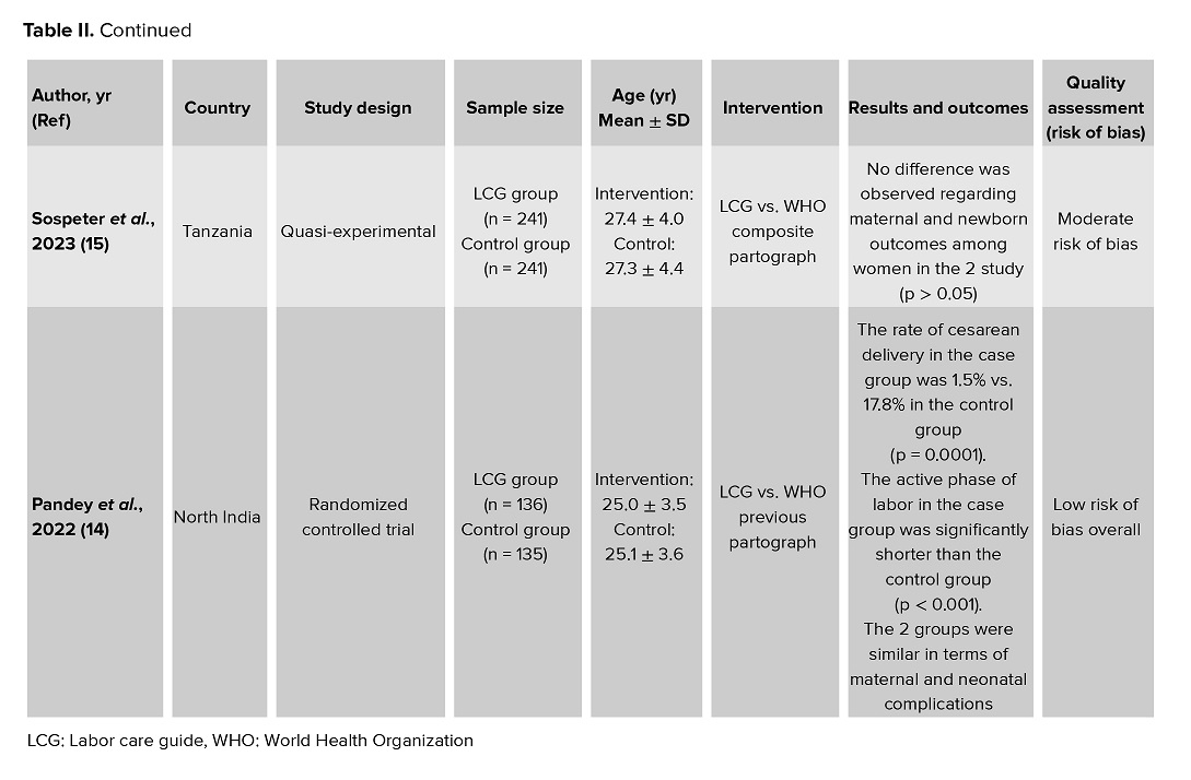 All 3 studies were conducted in public hospitals and involved staff training on the use of the LCG. 2 studies, included low-risk women with term pregnancies (37-40 wk gestation), cephalic presentation, and spontaneous labor onset, while women with high-risk pregnancies or prior high-risk obstetric histories were excluded (14, 15). Another study included pregnancies beyond 20 wk and applied the Robson classification to both intervention and control groups (16).