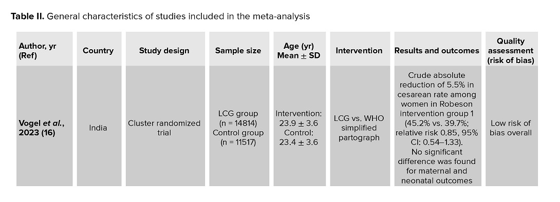 This study is a meta-analysis of clinical trials conducted to evaluate the impact of implementing (WHO LCG) on maternal and neonatal outcomes. The study design and reporting adhered to the PRISMA guidelines (12).