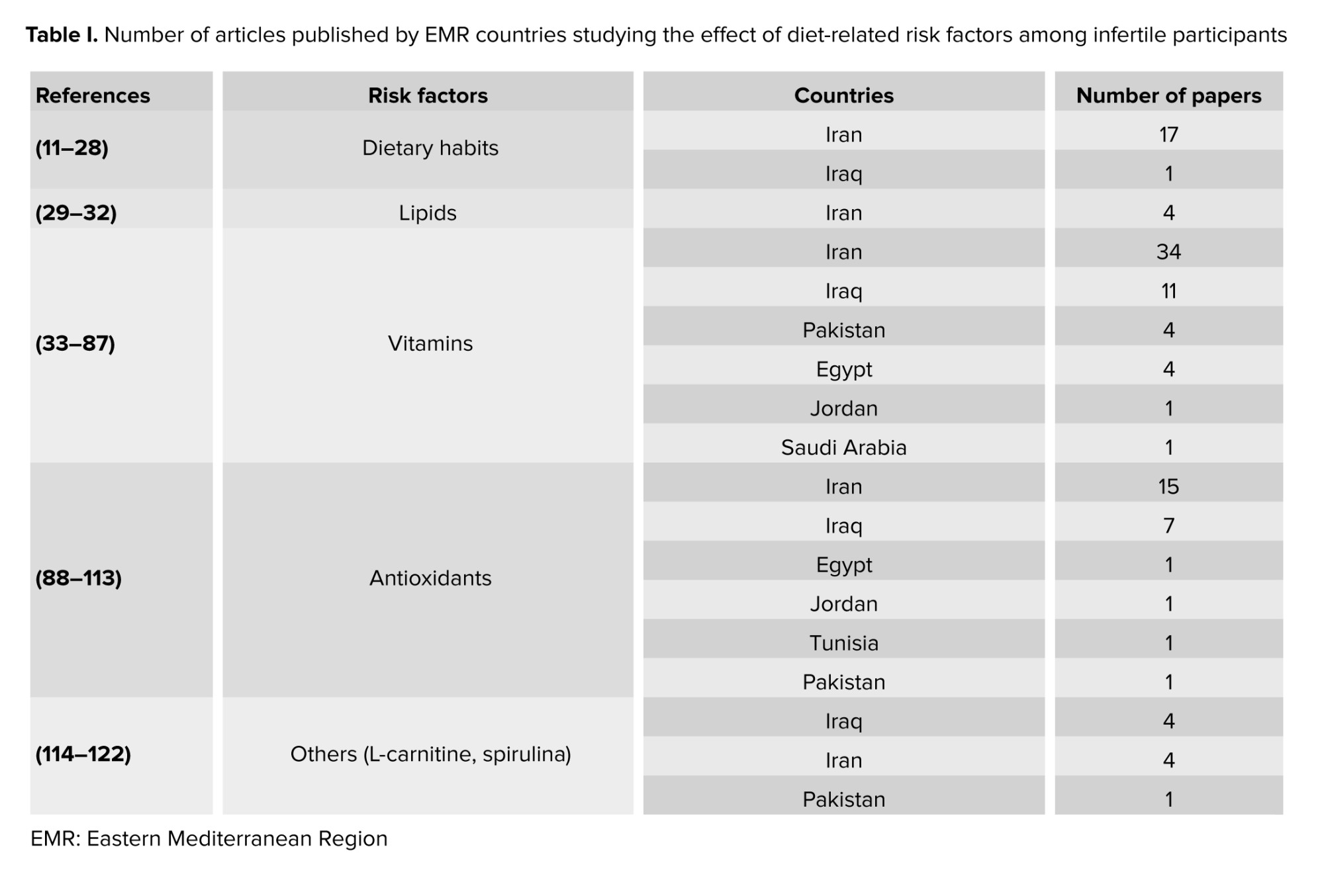 The current review aims to discuss the impact of dietary habits, including food types and dietary supplements, on fertility in the EMR. PubMed and Scopus databases were used for the literature search. The search was restricted to publications between January 2012 and July 2023. Moreover, this review was conducted with limited search words and is subject to limitations, including potential omissions of references, and should not be interpreted as an intentional omission, as it does not adhere to the systematic review methodology. Only 112 publications met the inclusion criteria and were considered suitable for this review (Figure 1), as they directly covered dietary habits and food supplementation’s effects on reproduction in the EMR. The studies were mainly conducted in the following countries: Iran (66%), Iraq (20.5%), and Pakistan (5.3%) (Table I). Only 7 countries of the EMR published data matched the inclusion criteria of the review.