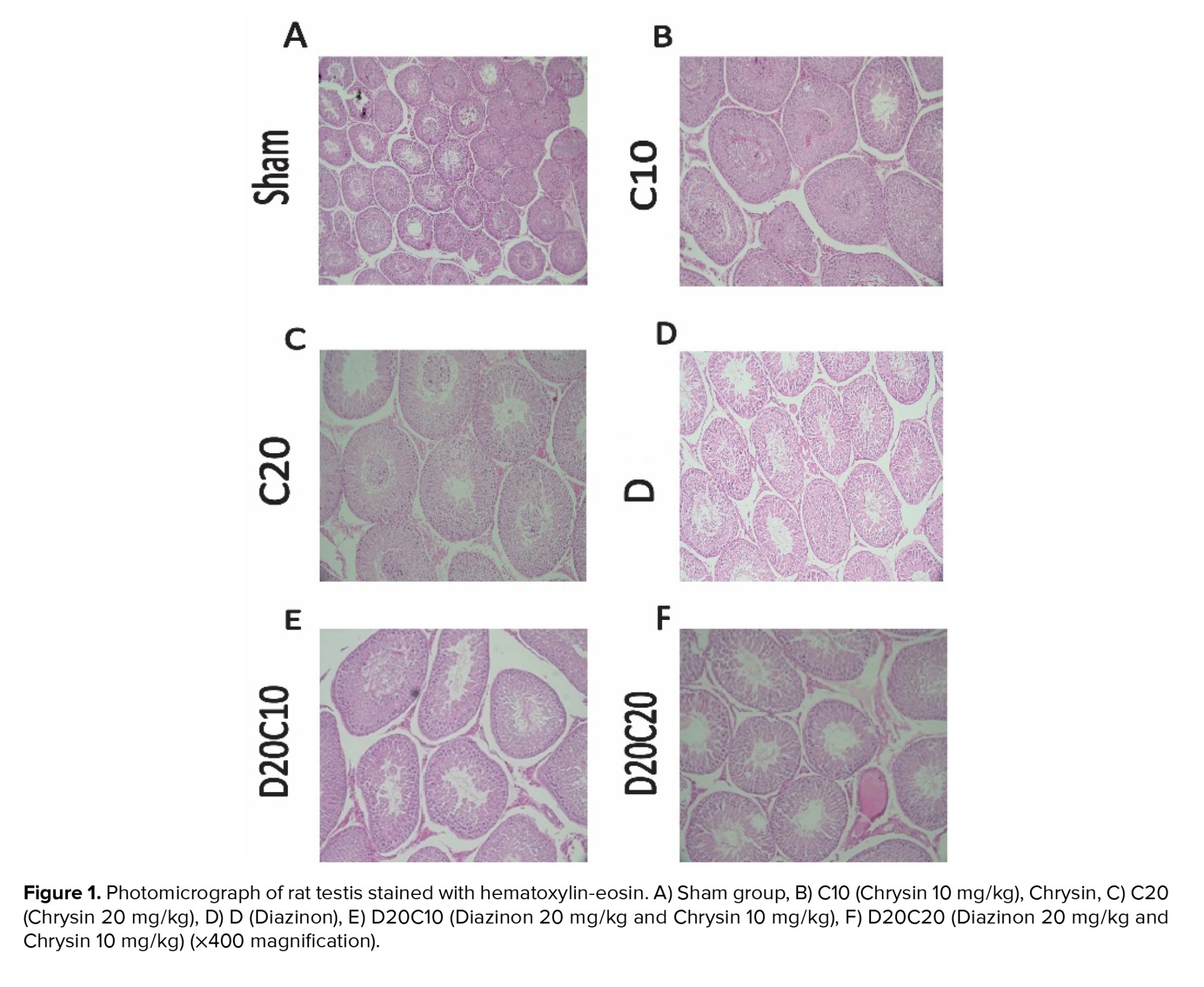 The results of the photo microgram of the testes of rats stained with hematoxylin and eosin (Figure 1) show that in C10 (Figure 1B) and C20 (Figure 1C) groups, the diameter and area of the lumen and the diameter of the epithelium of the spermatogenic tubules are completely normal. Still, in the D group (Figure 1D), due to the destruction of germ cells, the diameter and area of the lumen increased compared to other groups, and the diameter of the epithelium decreased compared to other groups. In addition, C was able to somewhat reduce the diameter and area of the lumen in the D20C10 (Figure 1E) and D20C20 (Figure 1F) groups compared to the D group and increase the diameter of the epithelium compared to the D group.