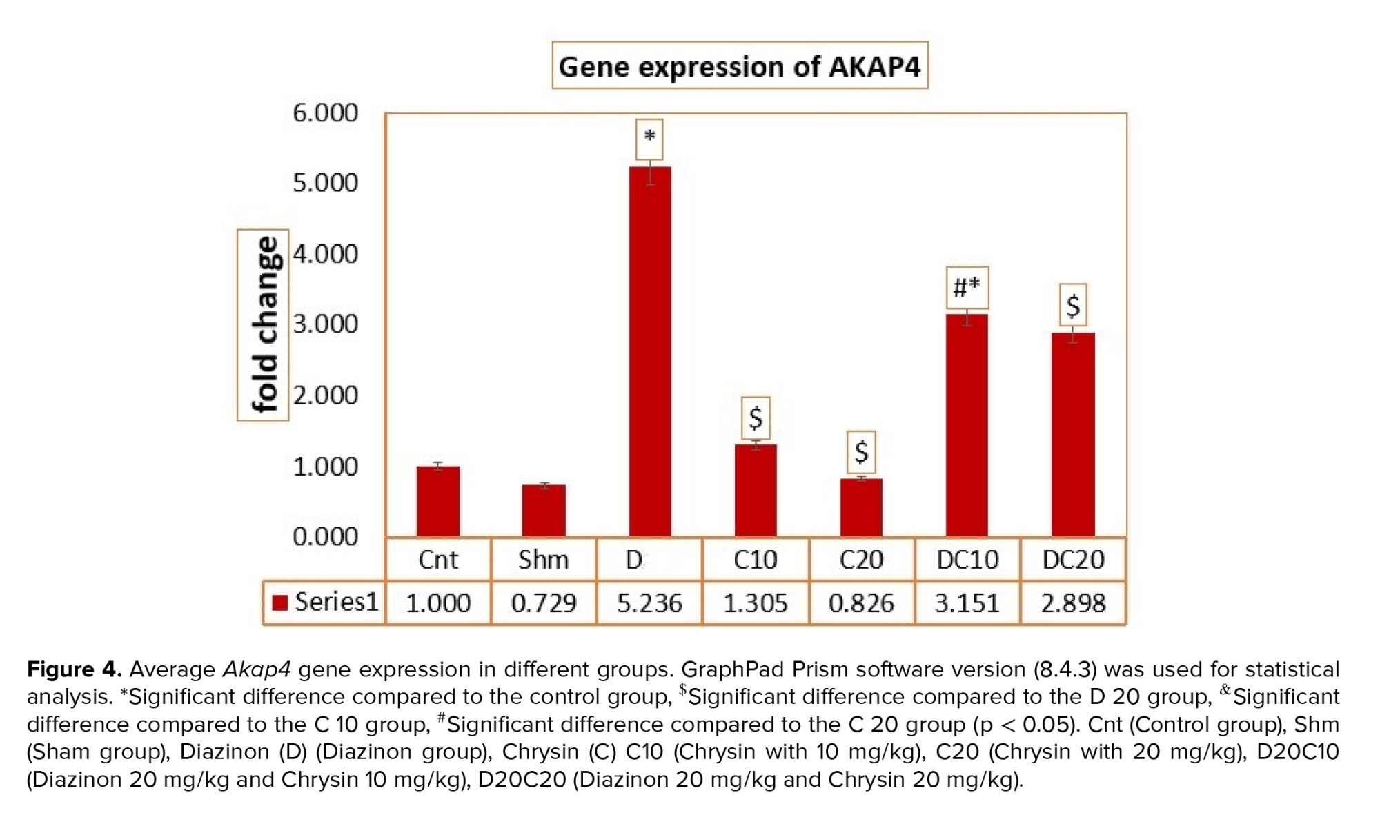 The average expression value of Akap4 gene F (11.662) and its significance at p < 0.0001 indicates a significant difference in the average expression of the Akap4 gene using the ANOVA test. Among the different groups, the average Akap4 gene expression in the D group increased compared to the Cnt and Sham groups (p < 0.0001), which caused gene expression modulation in the treatment groups. In this way, in the C10 (p < 0.0001), C20 (p < 0.0001) and D20C20 (p = 0.03) groups compared to D group (p < 0.05), Akap4 gene expression has shown a more significant decrease, which indicates the modulation of gene expression by using C (Figure 4).