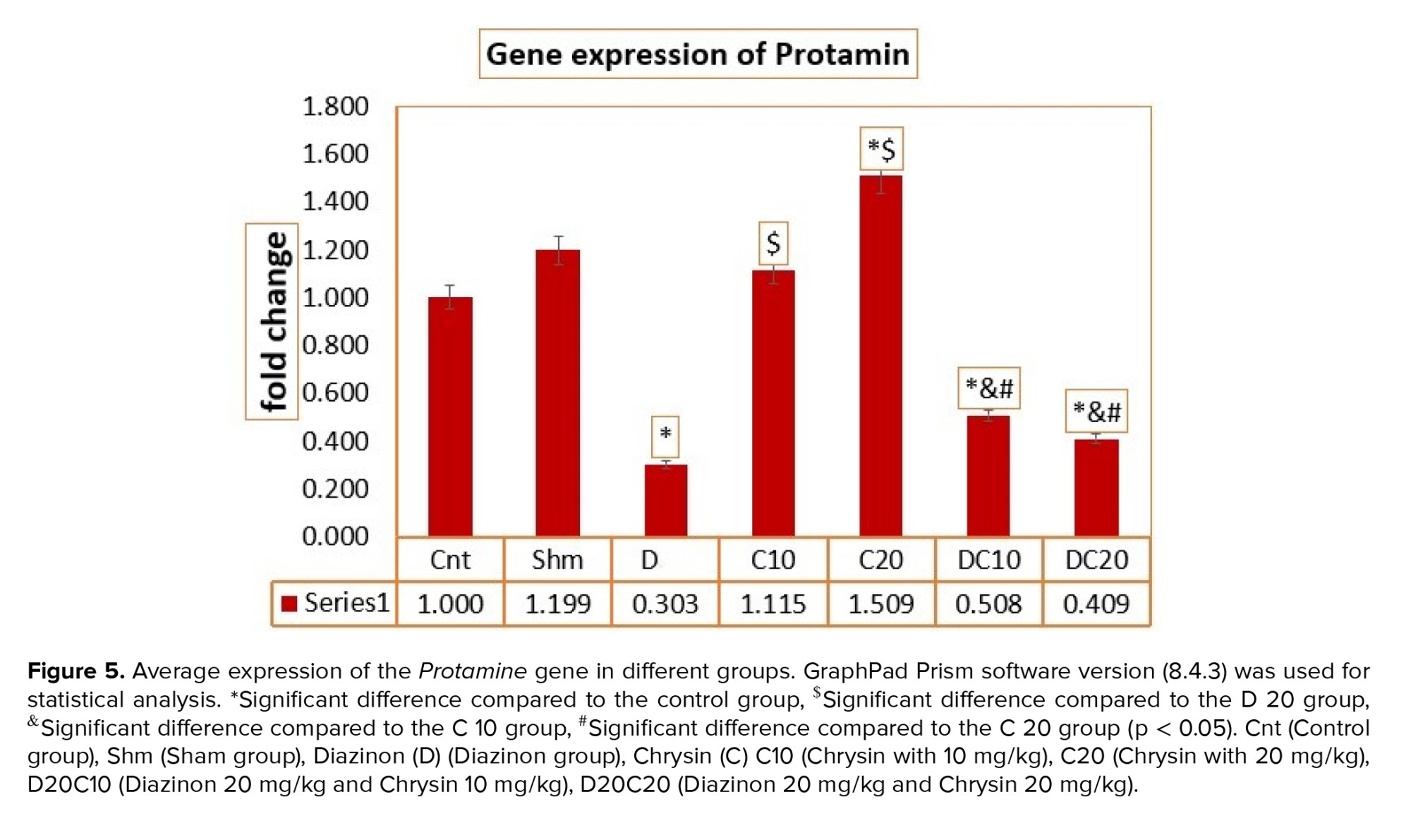 The results of the ANOVA test for the average expression of the protamine gene in different research groups, F value (20.132), show the average expression of the protamine gene among different groups. The average expression of the protamine gene in the D group was decreased compared to the Cnt and Sham groups (p < 0.0001). After treatment, protamine gene expression was increased. In the C10 and C20 groups, protamine gene expression showed a significant increase compared to the D20C10 and D20C20 groups (p < 0.0001). It can be concluded that the C treatment group was able to compensate for the decrease in protamine gene expression better than the D treatment groups (Figure 5).