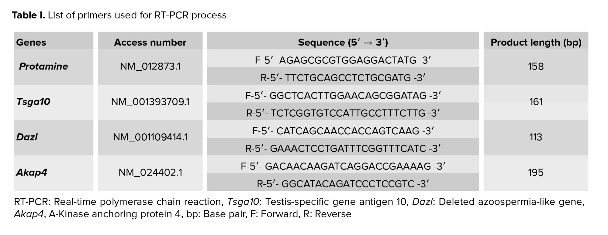 There are specific genes in the testes, called chauvinist genes, that play an important role in the process of spermatogenesis (8). The autosomal gene deleted in the deleted azoospermia gene (DAZL) is a member of the chauvinist genes that play an important role in reproduction and differentiation of germ cells. The testis-specific antigen 10 gene (Tsga10) is one of the testis-specific genes that is expressed in the last stages of spermatogenesis and plays an important role in the fibrous coating of the sperm tail (9). Moreover, protamines are unique proteins of sperm that package and protect the hereditary chromatin until fertilization (10). In addition, A-Kinase anchoring protein 4 (Akap4) is expressed in the post-meiotic stage of spermatogenesis and produces many proteins in the fibrous sheath of sperm flagella (11).