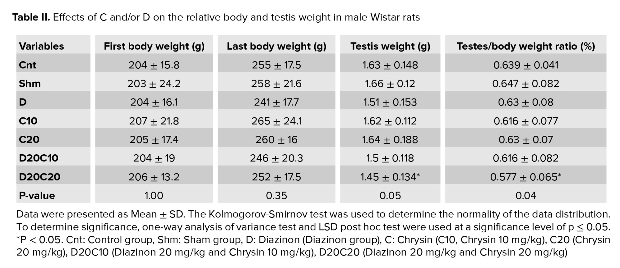Evaluation of the average initial weight and the last day's BW of the rats showed that no significant difference was observed between the 7 groups. Examining the average weight of the testis in the D20C20 group compared to the Cnt (p = 0.03), Sham (p = 0.01), and D (p = 0.03) groups had decreased, which was statistically significant. In addition, the examination of the difference in the average ratio of testis weight to BW showed that a significant difference was observed between the Sham (p = 0.04) and Cnt (p = 0.05) groups and the D20C20 experimental group. In contrast, no significant difference was observed between the other groups (Table II).