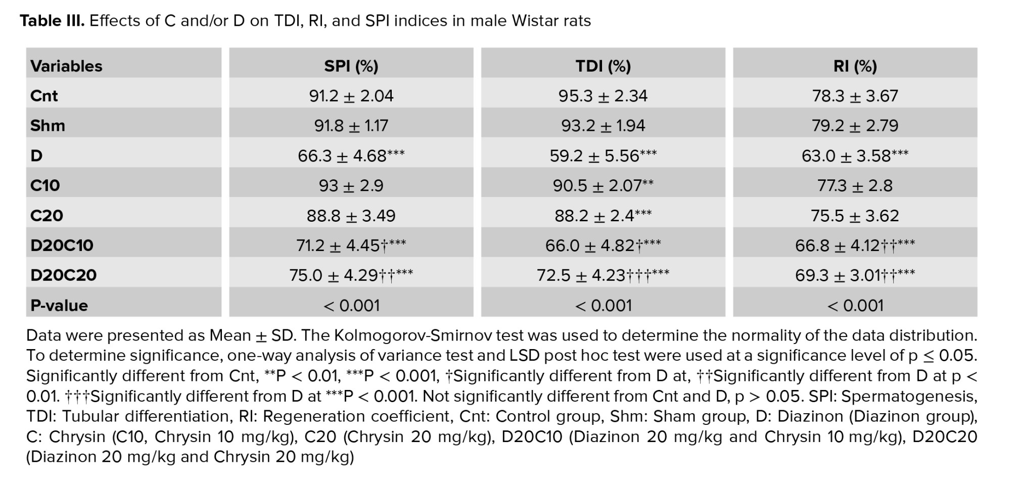 The results of the ANOVA test related to SPSS software showed that the average spermatogenesis in the D group compared to the sham and Cnt groups (p < 0.001) decreased significantly. In the experimental groups, D20C20 (p < 0.001) and D20C10 (p = 0.023) increased significantly compared to the D group, while no significant difference was observed in other groups. In addition, examination of the average tubular differentiation showed that in the D group, the average TDI decreased significantly compared to the Sham and Cnt groups (p < 0.001), if the TDI in the intervention groups D20C20 (p < 0.001) and D20C10 (p = 0.002) increased compared to D. Also, the results of the average regeneration coefficient showed that in the D group, the RI was significantly reduced compared to the Sham and Cnt groups (p < 0.001). This reduction was significantly moderated by using the D20C20 (p = 0.003) and D20C10 (p = 0.050) treatment groups compared to the D group, no significant difference was observed in other groups (Table III).