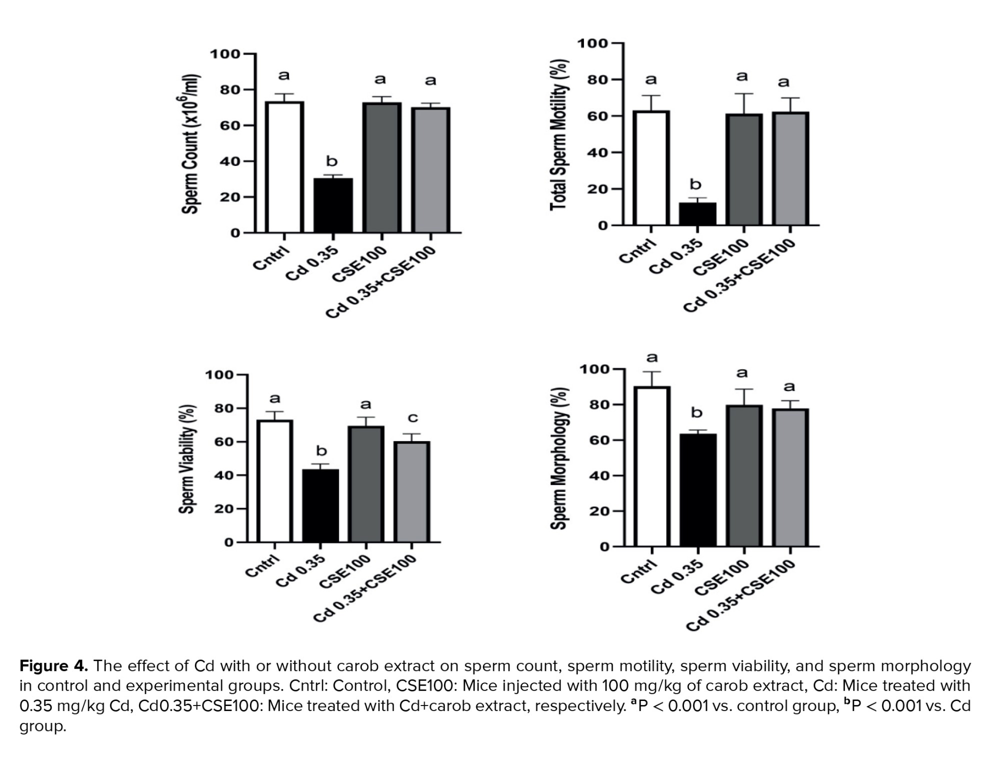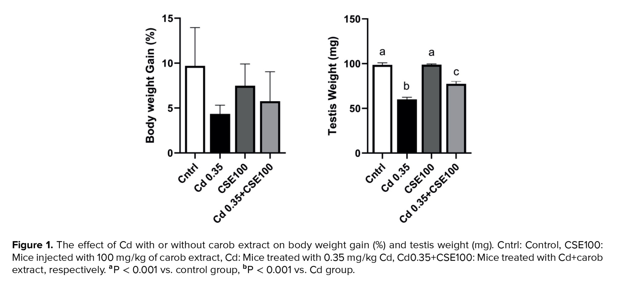 A recent study has specifically targeted plant-derived products with antioxidant properties to protect cells and tissues from Cd toxicity in both animals and humans (7). These bioactive compounds, readily available in plants at low cost and considered safe, can effectively neutralize reactive oxygen species or bind to metals, serving as natural antagonists to Cd (8). Ceratonia siliqua L., also known as carob or locust, belongs to the Fabaceae family and is an evergreen tree originating from the Mediterranean and Middle East regions (9). The fruits of this tree are highly nutritious and boast numerous medicinal applications, including serving as diuretics, purgatives, antidiabetic agents, laxatives, antimicrobials, anti-inflammatories, anti-diarrheals, antiulcer remedies, antioxidants, gastroprotective agents, anti-constipation aids, and hepatoprotective agents (10, 11). In recent years, carob has garnered attention due to its abundant polyphenolic content and remarkable antioxidant capabilities (12). These bioactive compounds, which include proanthocyanidin, ellagitannin, and gallotannin, as well as tannins, flavonoids, anthocyanins, glycosides, alkaloids, and vitamins C, D, E, pyridoxine, niacin, and folic acid, along with numerous minerals such as calcium, magnesium, selenium, potassium, sodium, phosphorus, and iron, have been utilized in disease treatment and have demonstrated scavenging properties against reactive oxygen species (12, 13). Thus far, however, there have been no reports of toxicity associated with the use of carob (11). In traditional medicine of several Middle Eastern countries, carob fruit has been used as an aphrodisiac and supplement to enhance sexual desire, potency, and pleasure, as well as to increase human semen volume for the treatment of male infertility (14). Previous research has indicated that carob extract improves semen quality and elevates testosterone levels by enhancing the function of Leydig cells and the biosynthesis of testosterone, consequently leading to enhancements in the spermatogenesis process (15).