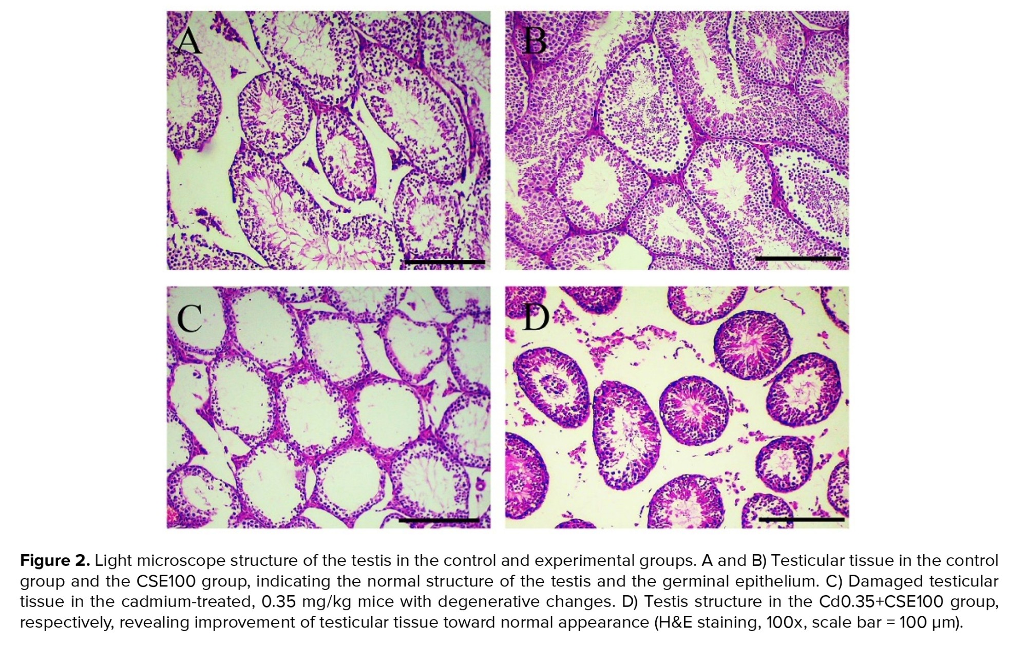 Histopathological examinations revealed that CSE treatment preserved normal morphological and histopathological structures in the testes of mice injected with Cd. Cd administration disrupted Leydig and Sertoli cells, most likely due to inducing oxidative stress (22). Studies have indicated that exposure to Cd leads to the deterioration of Sertoli and Leydig cells, impacting testosterone levels and resulting in testicular necrosis and atrophy (8, 17). These effects may be explained by Cd's ability to disrupt the integrity of the blood-testis barrier, trigger oxidative stress and the release of inflammatory cytokines such as tumor necrosis factor α, induce DNA damage, and initiate apoptosis in germ cells. Spermatogenesis is a complex process affected by genetic, hormonal, and environmental elements, and any disruption in these areas leads to decreased sperm quality, ultimately causing infertility (3). CSE administration, however, restored the structure of seminiferous tubules and various stages of spermatogenesis, likely thanks to the modulation of nitro-oxidative stress by its antioxidant components, such as flavonoids, vitamins C, D, and E, and numerous minerals found in this herbal remedy (12, 13, 15).