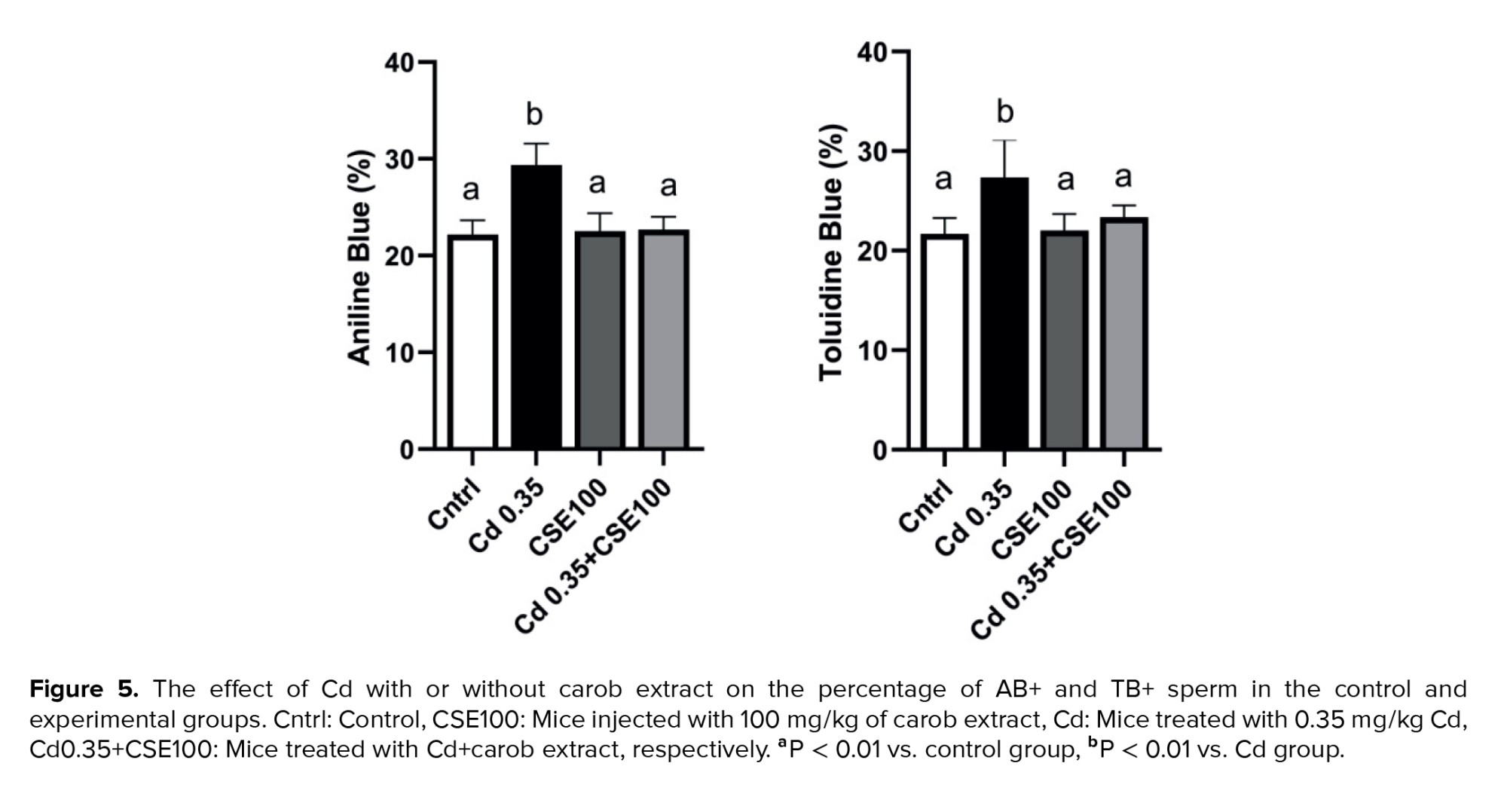 Cd treatment resulted in a significant reduction in sperm count, motility, and viability, along with a noticeable rise in abnormal morphology. These findings are consistent with previous research showing that Cd exposure leads to reductions in sperm concentration, motility, and viability, as well as an increase in abnormal sperm morphology (8, 24). These findings could be attributed to Cd-induced oxidative stress and apoptosis factors, which contribute to a subsequent decline in sperm quality (8). Further, these results are in accordance with prior research suggesting that even at low levels of Cd accumulation in semen, it could potentially contribute to poor sperm parameters by causing oxidative damage to sperm, ultimately leading to male subfertility and infertility (25). More notably, Cd treatment markedly increased the aniline blue and toluidine blue indexes in sperm, indicating chromatin fragmentation in sperm cells. Likewise, research has shown that men with unexplained infertility often have elevated Cd levels in their semen, which correlates with a notable increase in sperm DNA fragmentation and seminal reactive oxygen species levels (26). It was also demonstrated that Cd plays a role in causing abnormal modifications to histones in the sperm nucleus during spermiogenesis and leads to damage in the sperm's nuclear DNA (17, 26). Yet, CSE therapy protected sperm characteristics and chromatin quality against Cd-evoked detrimental effects. We attributed these beneficial effects to the CSE's ability to quench free radicals by preventing the production of new radicals or scavenging and eliminating reactive species. With key constituents such as vitamins C, E, D, and folic acid, along with essential minerals like magnesium and selenium, which are crucial for spermatogenesis, CSE could enhance sperm parameters (27). Another explanation for the improvement in sperm parameters is testosterone-related behaviors, since it was reported that carob extract improves testosterone levels significantly. In this context, it was indicated that treatment of infertile men with carob for 90 days significantly improved semen parameters, including sperm concentration and motility, leading to increased pregnancy rates (15).