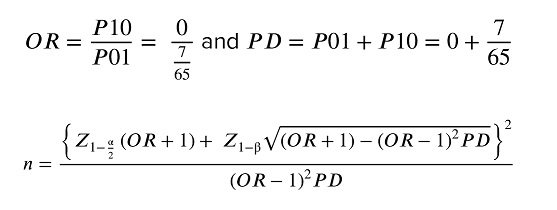 OR: odds ratio; P10/P01: discordant pairs; PD: P10+P01; Z: standard normal deviate: n: sample size; α: significance level (type I error); β: type II error (power: 1-β).