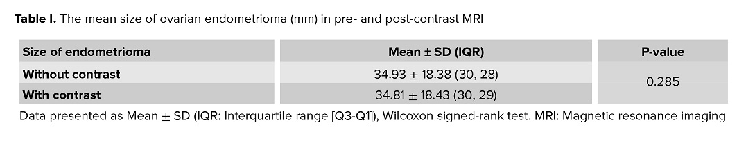 Additionally, no significant difference was noted in the mean size of ovarian endometriomas between non-contrast and post-contrast images (Table I).