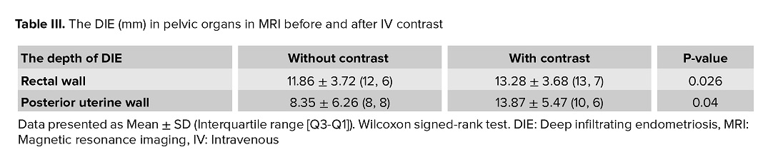 Table III provides a detailed evaluation of the depth of DIE, comparing findings between pre- and post-contrast MRI images. Regarding the depth of DIE, contrast-enhanced imaging significantly increased the detection of rectal wall involvement (p = 0.026) and posterior uterine wall involvement (p = 0.04) (Table III).