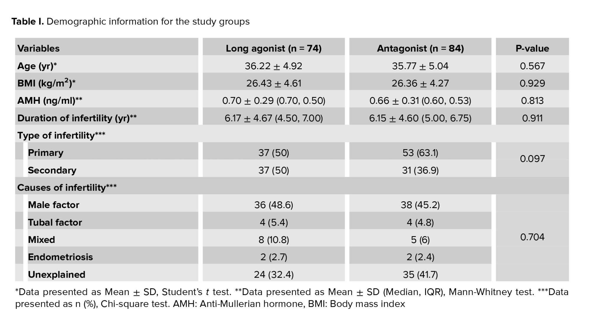Of the 190 women initially screened for eligibility, 20 were excluded due to not meeting the inclusion criteria. This resulted in 170 women meeting the inclusion criteria, of whom 158 cases were included in the study. As detailed in figure 1, in the long agonist group, 11 cases were dropouts due to loss of follow-up, resulting in final study groups of 74 women in the agonist group. In the antagonist group, 1 case was dropout due to loss of follow-up, resulting in final study groups of 84 women. The proportion of women who did not respond to the treatment protocol was similar, with 9 women (12.2%) in the agonist group and 10 women (11.9%) in the antagonist group. This difference was not statistically significant (p = 0.189). All demographic information of the study participants is summarized in table I.