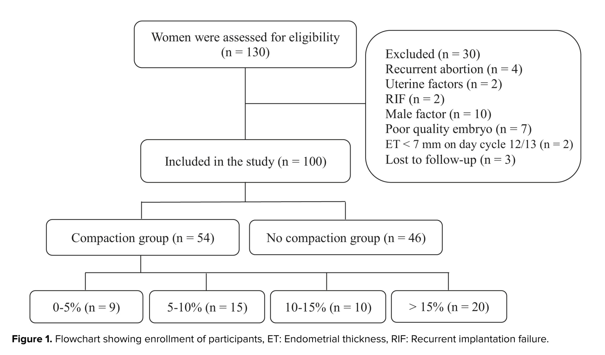 Initially, 130 women were eligible to enter the study. Of them, 30 women were excluded due to exclusion criteria. Finally, 100 women aged between 20 and 40 yr were analyzed and divided into 2 groups: compaction group (n = 54) and no compaction group (n = 46) (Figure 1).