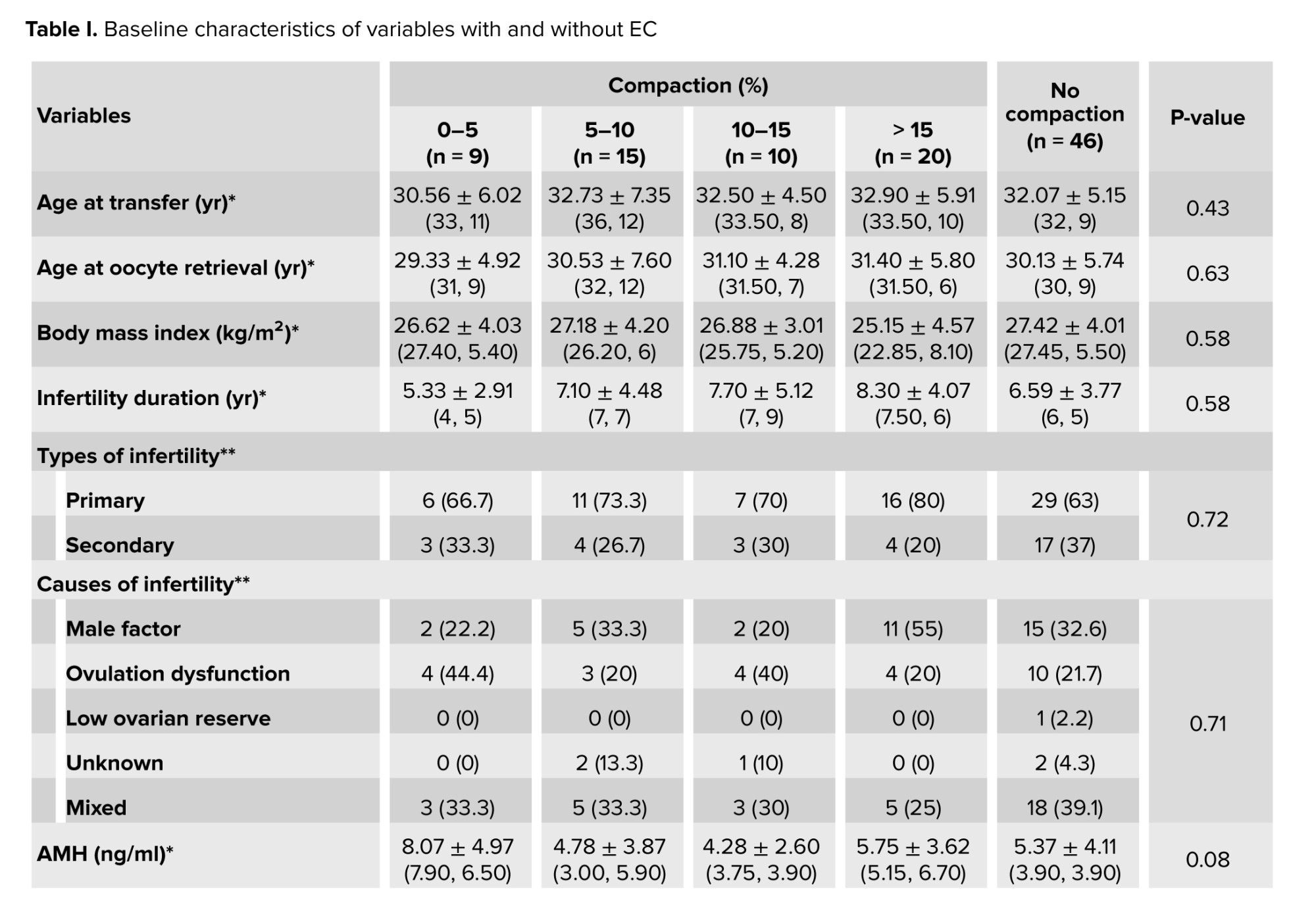 The participants were divided into 2 groups "compaction" or "no compaction" according to the difference in ET between the day of embryo transfer and the day of progesterone administration. Participants in the compaction group were subdivided into 4 subgroups based on the percentage of EC, which was defined as follows: < 5%, 5-10%, 10-15%, and > 15%. In all FET cycles, 46 women (46%) had no compaction, while 9 women (9%) had < 5%. Additionally, 15 women (15%) demonstrated EC 5-10%, 10 women (10%) EC 10-15%, and 20 women (20%) had EC > 15% on the day of embryo transfer.