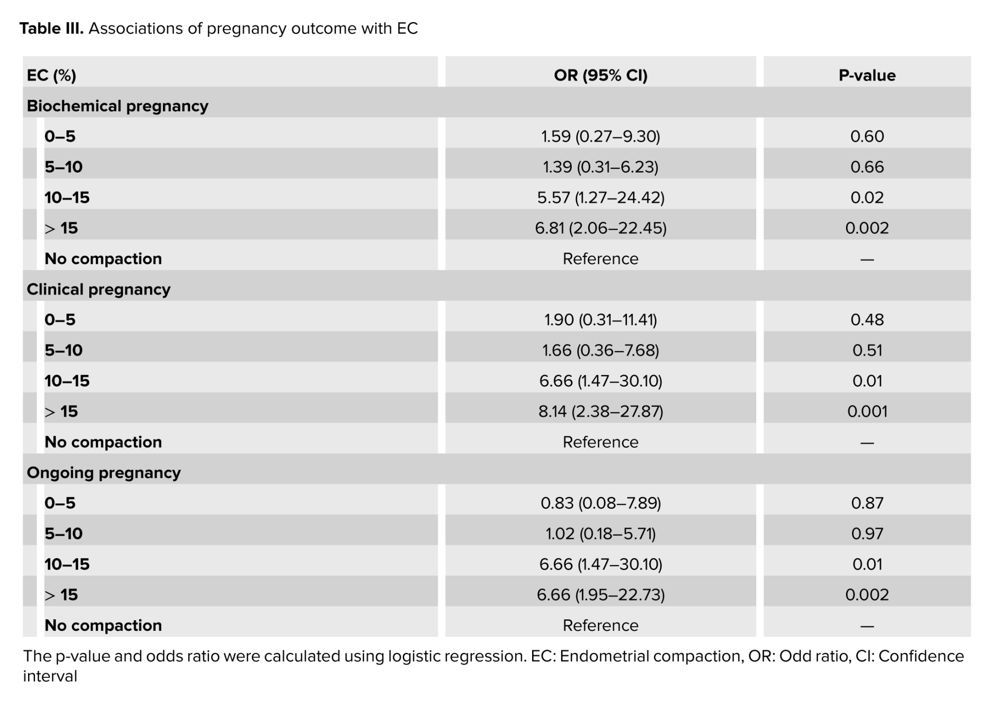 Subsequently, logistic regression was done to determine the effect of percentages of EC changes in the compaction group on ART outcome. The results demonstrated significantly higher biochemical, clinical, and OPR in EC 10-15% and above 15% compared to no compaction group. Hence, we found a significant influence of EC 10-15% (OR = 5.57; CI: 1.27-24.42; p = 0.02), (OR = 6.66; CI: 1.47-30.10; p = 0.01), (OR = 6.66; CI: 1.47-30.10; p = 0.01), and EC above 15% (OR = 6.81; CI: 2.06-22.45; p = 0.002), (OR = 8.14; CI: 2.38-27.87; p = 0.001), (OR = 6.66; CI: 1.95-22.73; p = 0.002) on biochemical, clinical and OPR, respectively (Table III).